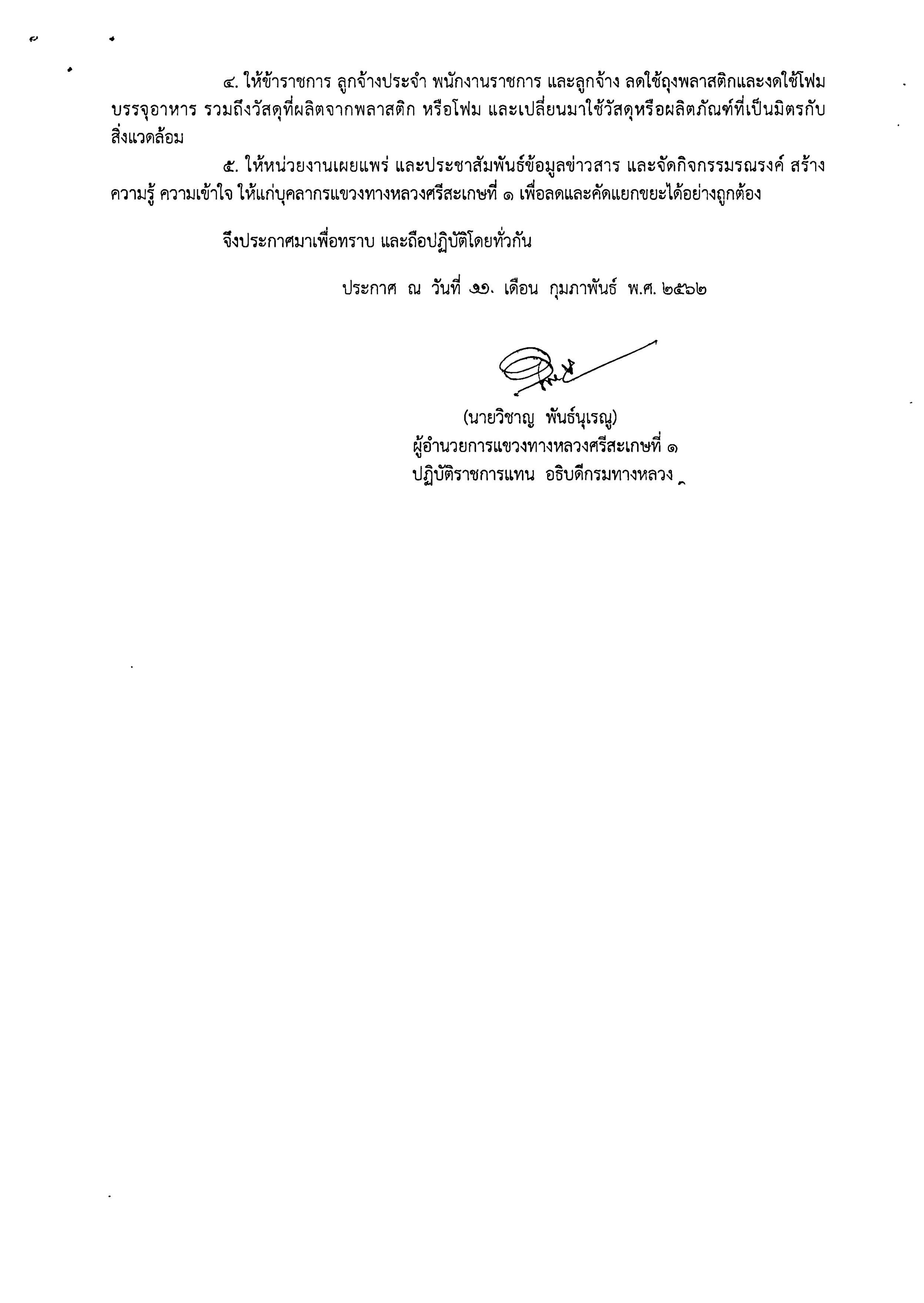 แขวงทางหลวงศรีสะเกษที่ 1 โดย นายวิชาญ พันธ์นุเรณู ผู้อำนวยการแขวงทางหลวงศรีสะเกษที่ 1 ได้ให้ความสำคัญในการช่วยลดภาวะโลกร้อน และการสร้างอุปนิสัย การคัดแยกขยะ ให้แก่ เจ้าหน้าที่แขวงทางหลวงศรีสะเกษที่ 1 และเจ้าหน้าที่หมวดทางหลวงในสังกัด ซึ่งเป็นจุดเริ่มต้นของการรับผิดชอบต่อสังคม