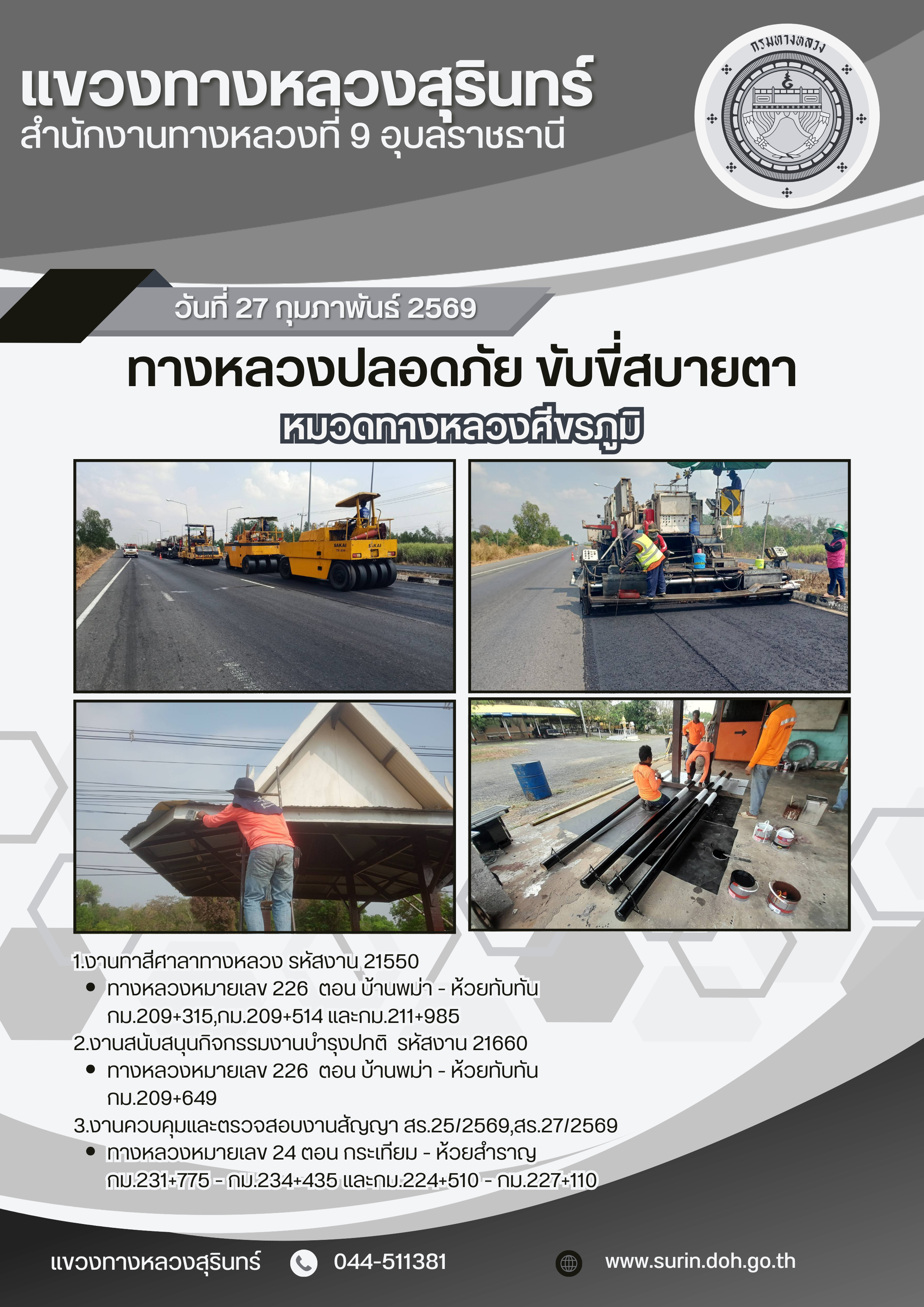 ทางหลวงปลอดภัย ขับขี่สบายตา 27 กุมภาพันธ์ 2569 |