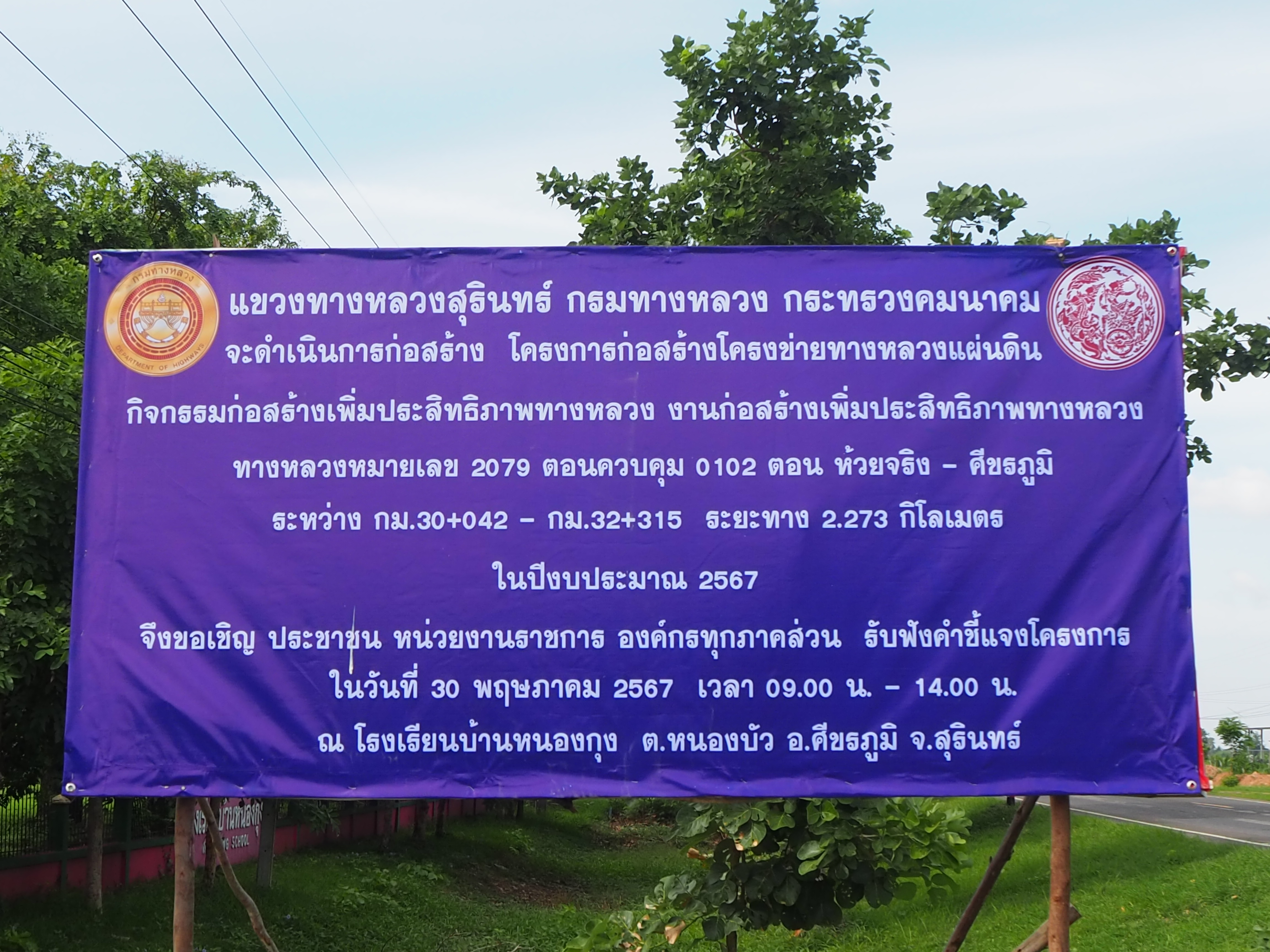แขวงทางหลวงสุรินทร์ ได้ดำเนินการจัดการมีส่วนร่วมของประชาชน ปีงบประมาณ 2567 โครงการก่อสร้างโครงข่ายทางหลวงแผ่นดิน สำหรับ กิจกรรมยกระดับมาตรฐานและเพิ่มประสิทธิภาพทางหลวง ทางหลวงหมายเลข 2079 ตอนควบคุม 0102 ตอน ห้วยจริง - ศีขรภูมิ ระหว่าง กม.30+042 - กม.32+315 ระยะทาง 2.273 กิโลเมตร โดยดำเนินการประชุมในวันพฤหัสบดี ที่ 30 พฤษภาคม 2567 เวลา 09.00 น.– 14.00 น. ณ โรงเรียนบ้านหนองกุงตำบลหนองบัว อำเภอศีขรภูมิ จังหวัดสุรินทร์ เสร็จเรียบร้อยแล้ว