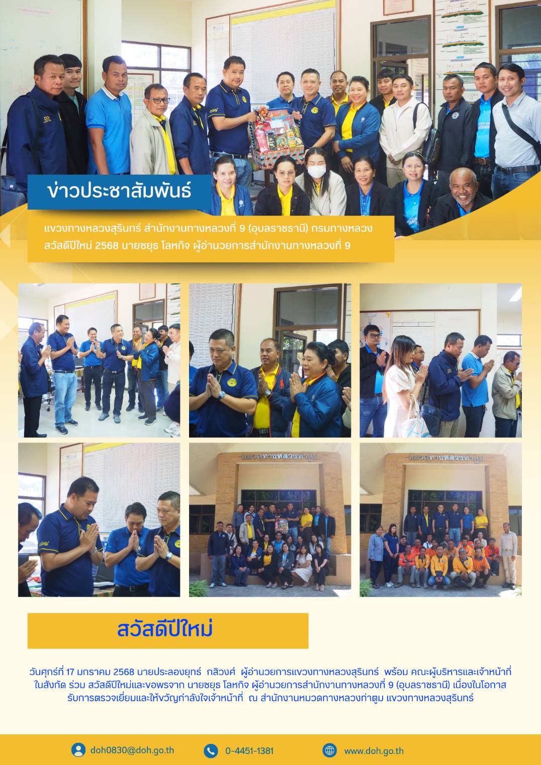 นายประลองยุทธ์ กสิวงศ์ ผู้อำนวยการแขวงทางหลวงสุรินทร์ พร้อม คณะผู้บริหารและเจ้าหน้าที่ในสังกัด ร่วม สวัสดีปีใหม่และขอพรจาก นายชยุธ โลหกิจ ผู้อำนวยการสำนักงานทางหลวงที่ 9 (อุบลราชธานี) เนื่องในโอกาสรับการตรวจเยี่ยมและให้ขวัญกำลังใจเจ้าหน้าที่ ณ สำนักงานหมวดทางหลวงท่าตูม แขวงทางหลวงสุรินทร์