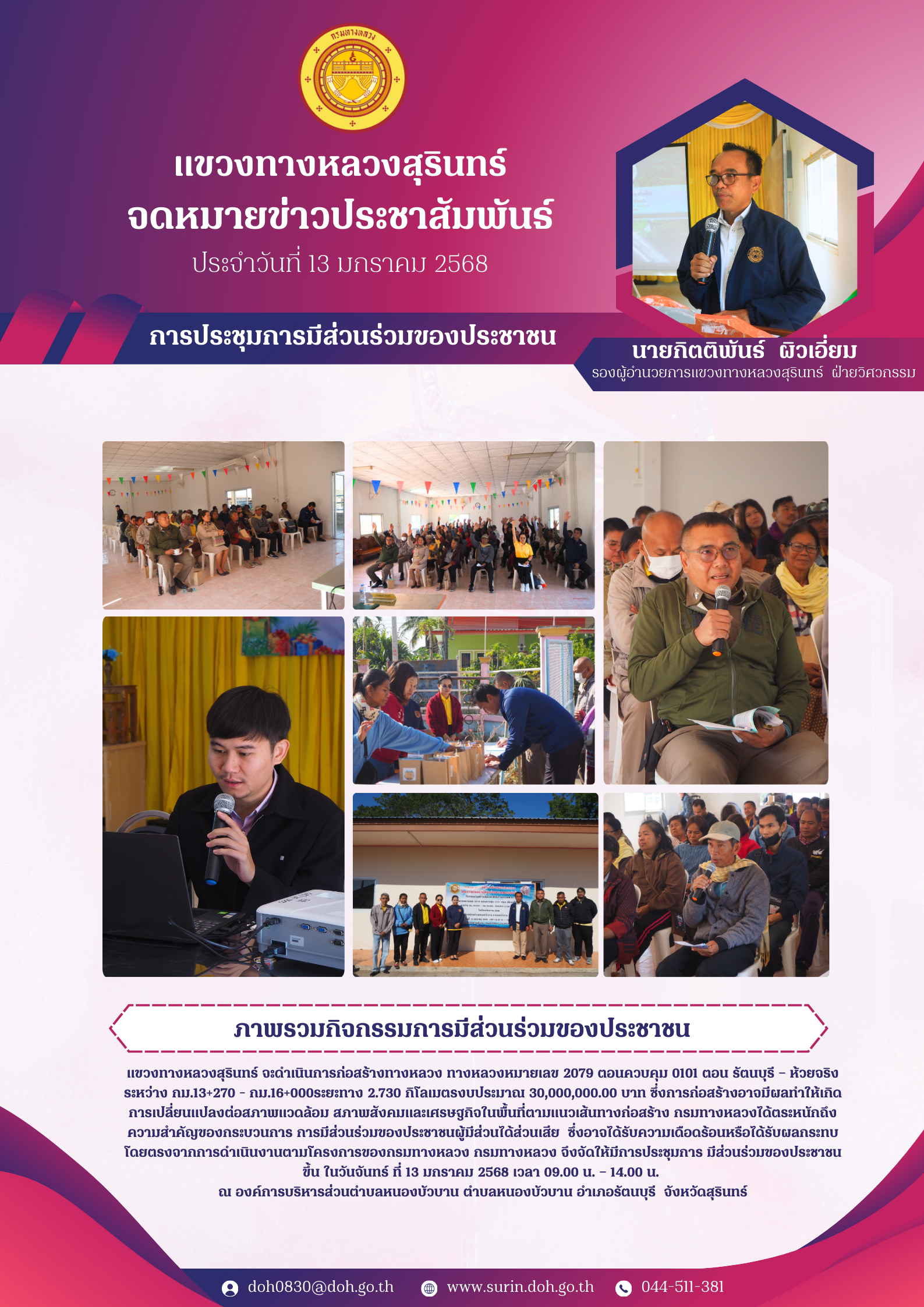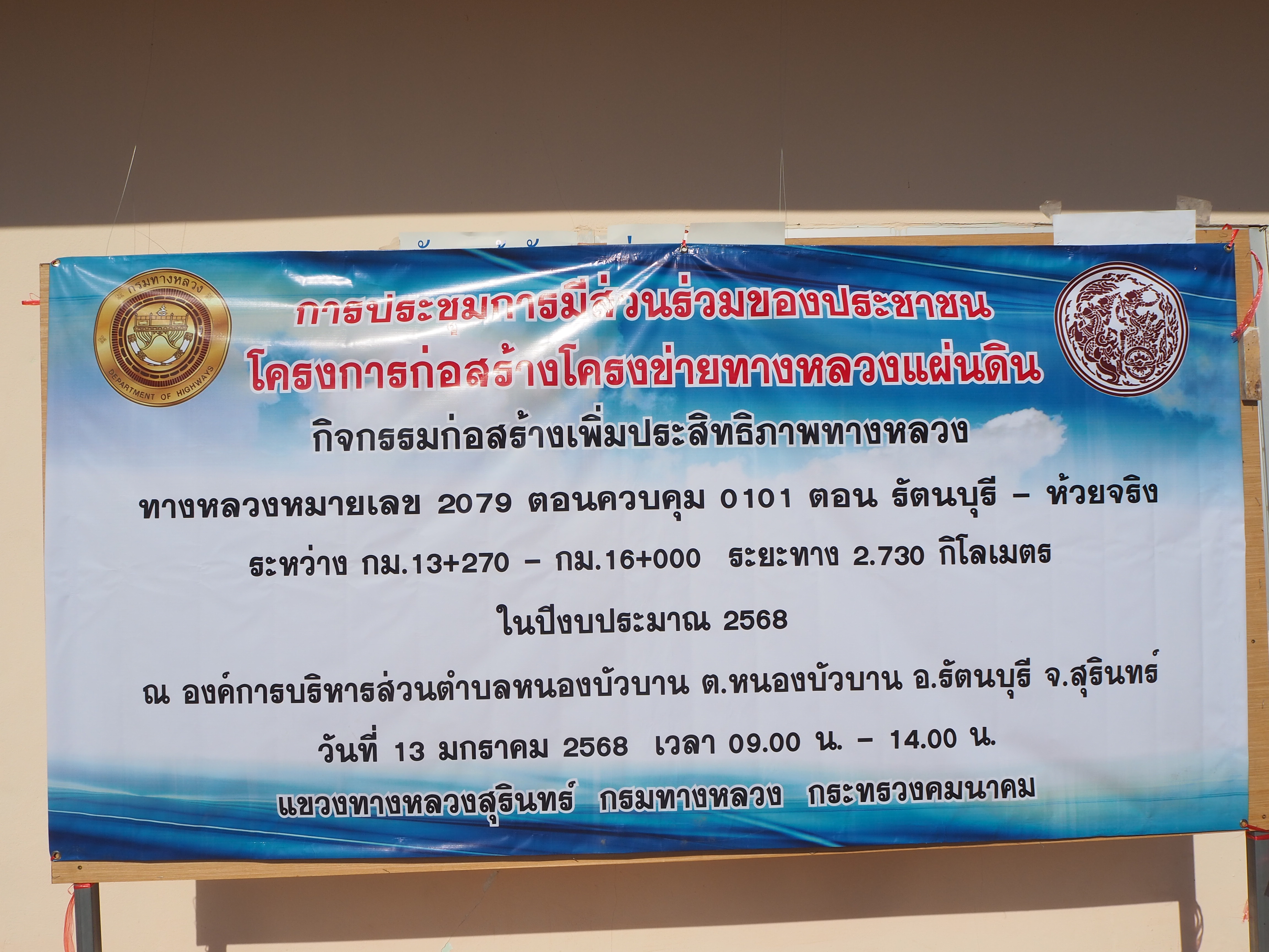 ด้วยแขวงทางหลวงสุรินทร์ จะดำเนินการก่อสร้างทางหลวงหมายเลข ทางหลวงหมายเลข 2079 ตอนควบคุม 0101 ตอน รัตนบุรี – ห้วยจริง ระหว่าง กม.13+270 - กม.16+000 ระยะทาง 2.730 กิโลเมตร งบประมาณ 30,000,000.00 บาท ซึ่งการก่อสร้างอาจมีผลทำให้เกิดการเปลี่ยนแปลงต่อสภาพแวดล้อม สภาพสังคมและเศรษฐกิจในพื้นที่ตามแนวเส้นทางก่อสร้าง กรมทางหลวง ได้ตระหนักถึงความสำคัญของกระบวนการการมี ส่วนร่วมของประชาชน ผู้มีส่วนได้ส่วนเสีย ซึ่งอาจได้รับความเดือดร้อนหรือได้รับผลกระทบโดยตรง จากการดำเนินงานตามโครงการของกรมทางหลวง เพื่อเปิดโอกาสให้ประชาชนได้รับทราบข้อมูลข่าวสารและได้แสดงความคิดเห็นหรือข้อเสนอแนะต่อการดำเนินโครงการของกรมทางหลวง จึงได้จัดให้มีการประชุมการมีส่วนร่วมของประชาชนขึ้น ในวันจันทร์ ที่ 13 มกราคม 2568 เวลา 09.00 น. – 14.00 น. ณ องค์การบริหารส่วนตำบลหนองบัวบาน ตำบลหนองบัวบาน อำเภอรัตนบุรี จังหวัดสุรินทร์