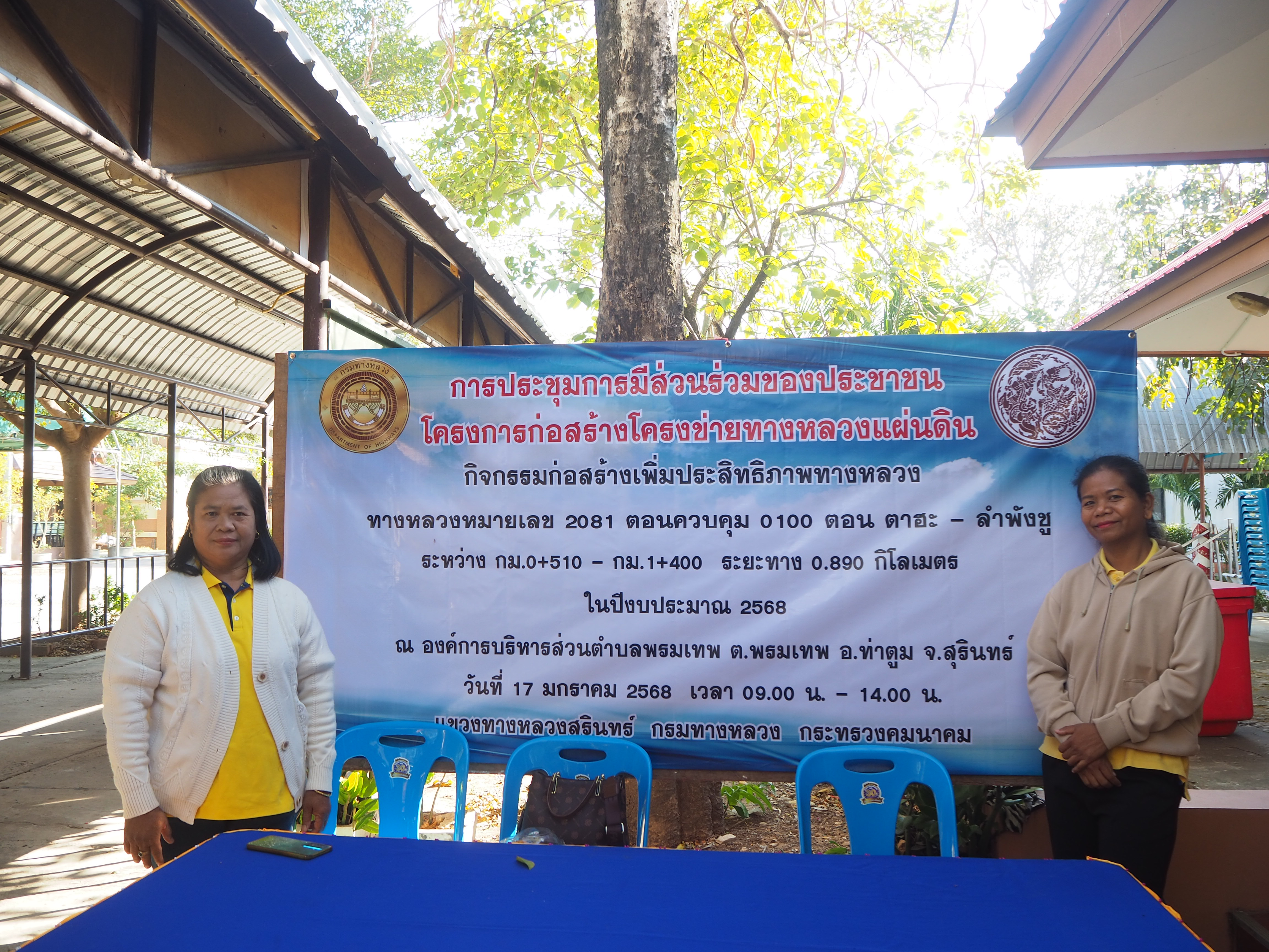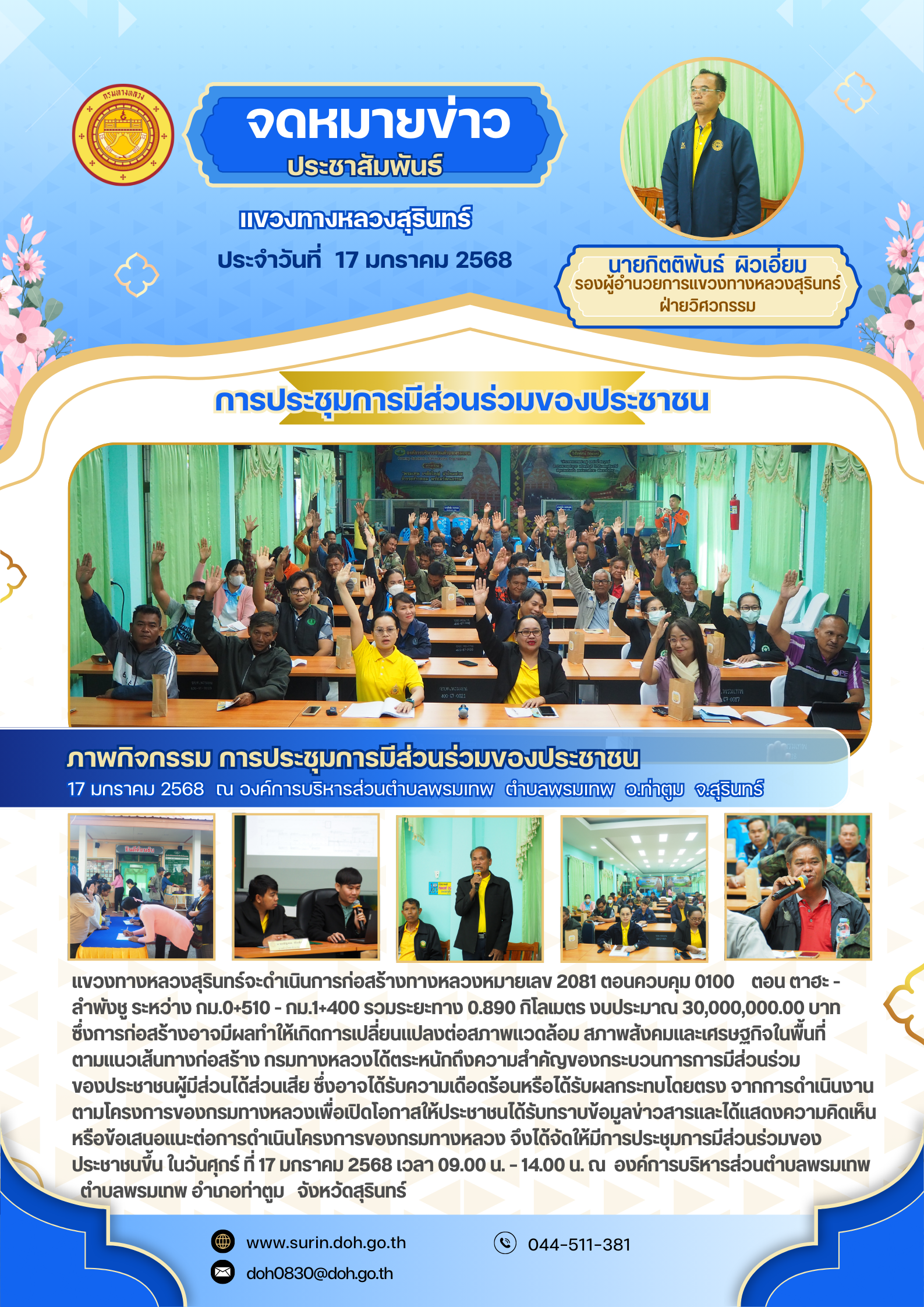 ด้วยแขวงทางหลวงสุรินทร์ จะดำเนินการก่อสร้างทางหลวงหมายเลข 2081 ตอนควบคุม 0100 ตอน ตาฮะ - ลำพังชู ระหว่าง กม.0+510 - กม.1+400 รวมระยะทาง 0.890 กิโลเมตร งบประมาณ 30,000,000.00 บาท ซึ่งการก่อสร้างอาจมีผลทำให้เกิดการเปลี่ยนแปลงต่อสภาพแวดล้อม สภาพสังคมและเศรษฐกิจในพื้นที่ตามแนวเส้นทางก่อสร้าง กรมทางหลวง ได้ตระหนักถึงความสำคัญของกระบวนการการมีส่วนร่วมของประชาชนผู้มีส่วนได้ส่วนเสีย ซึ่งอาจได้รับความเดือดร้อนหรือได้รับผลกระทบโดยตรง จากการดำเนินงานตามโครงการของกรมทางหลวง เพื่อเปิดโอกาสให้ประชาชนได้รับทราบข้อมูลข่าวสารและได้แสดงความคิดเห็นหรือข้อเสนอแนะต่อการดำเนินโครงการของกรมทางหลวง จึงได้จัดให้มีการประชุมการมีส่วนร่วมของประชาชนขึ้น ในวันศุกร์ ที่ 17 มกราคม 2568 เวลา 09.00 น. – 14.00 น. ณ องค์การบริหารส่วนตำบลพรมเทพ ตำบลพรมเทพ