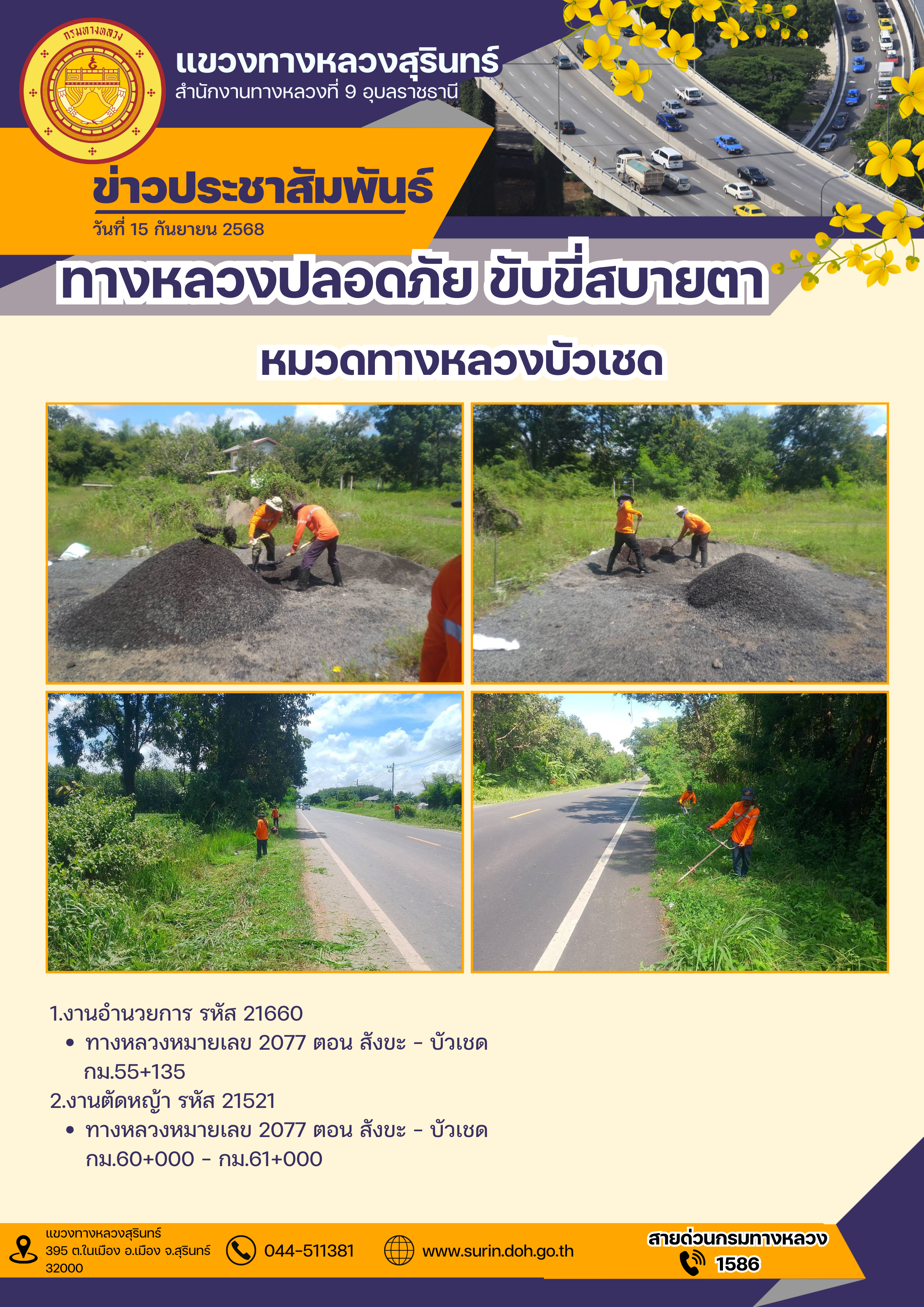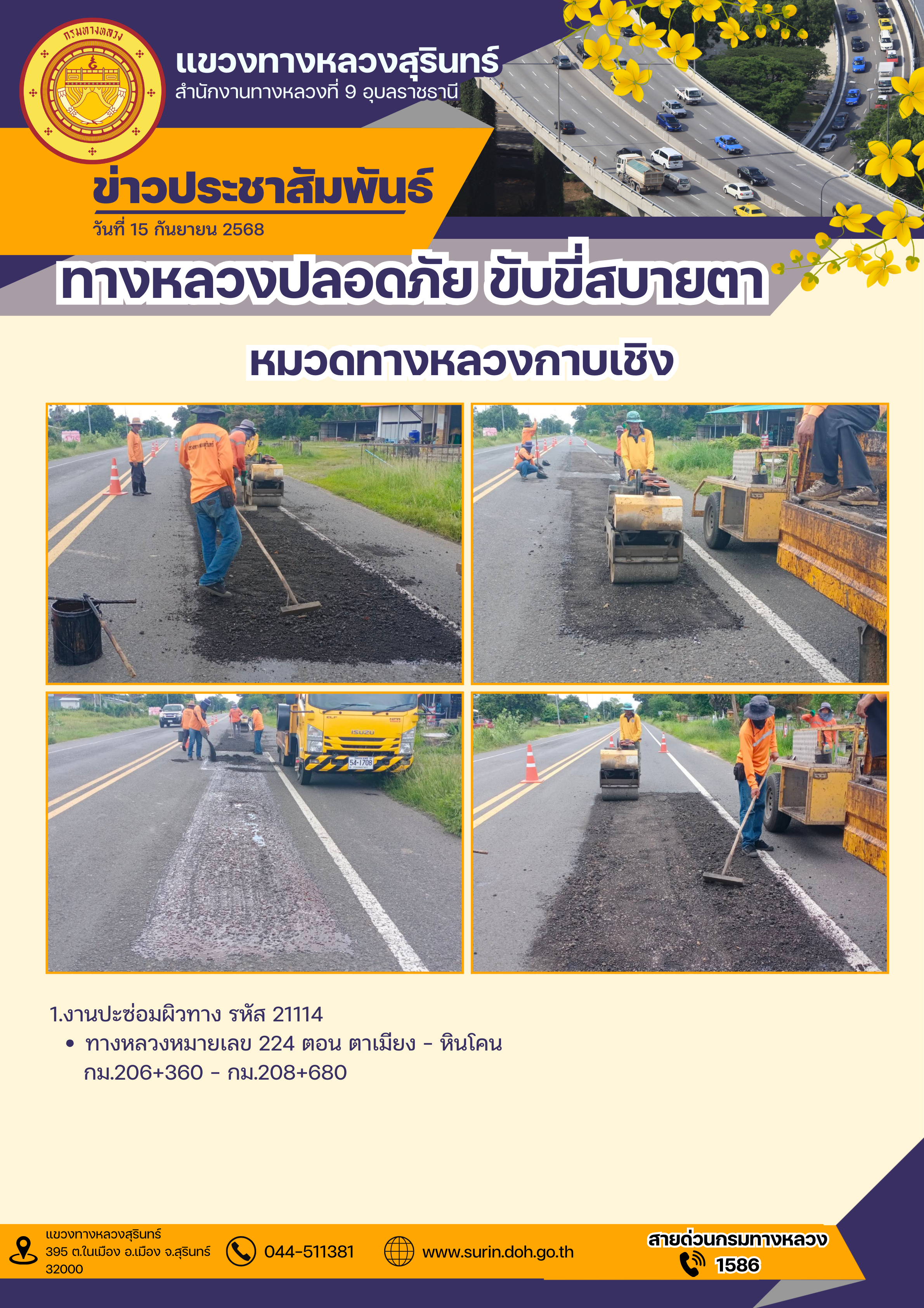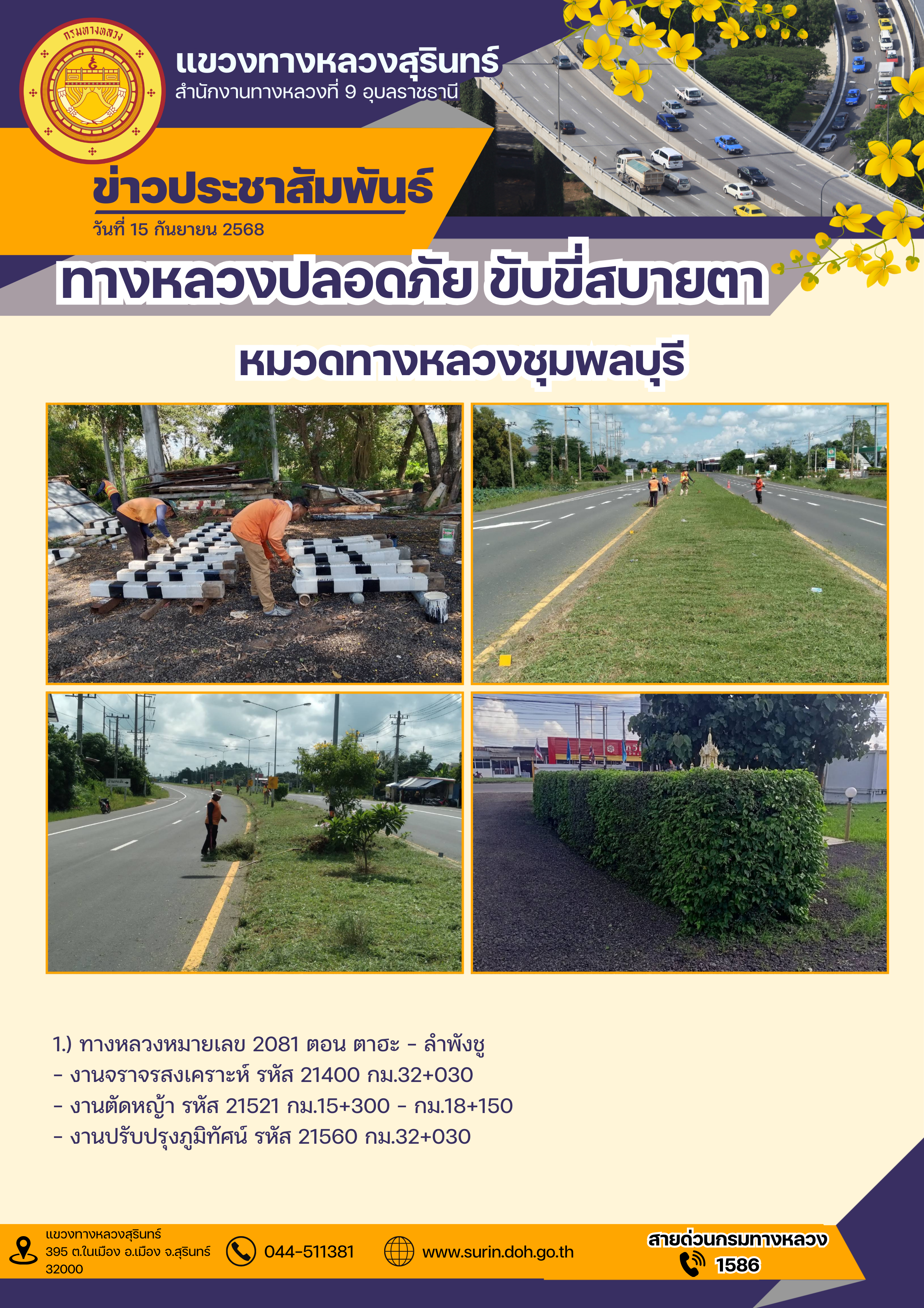 ข้อมูลข่าว : ทางหลวงปลอดภัย ขับขี่สบายตา 15 กันยายน 2568