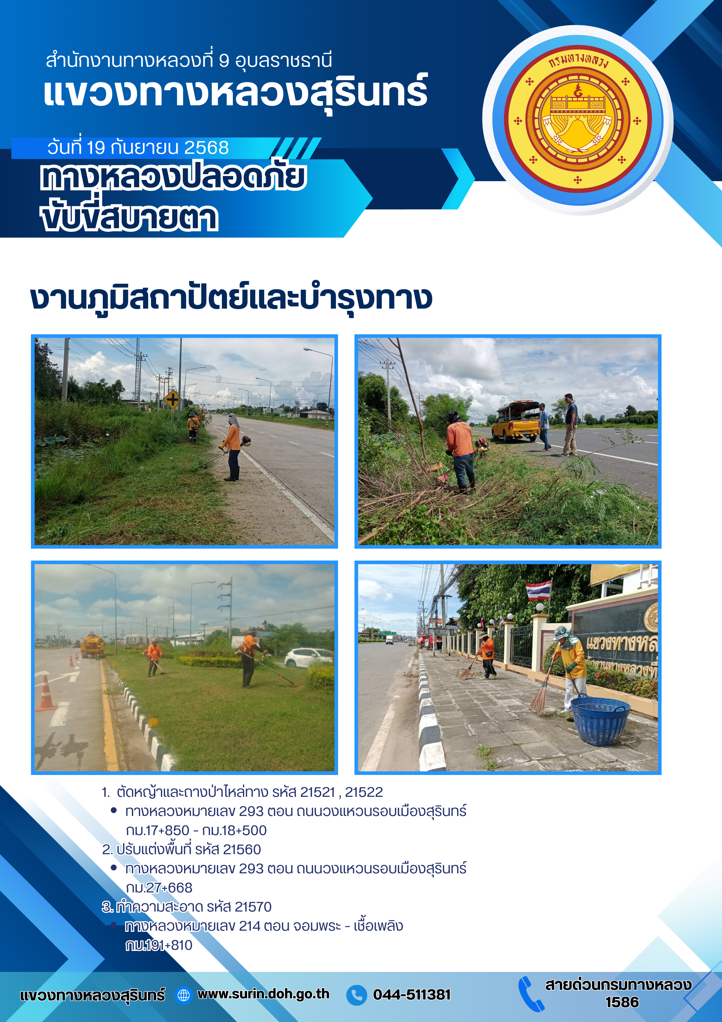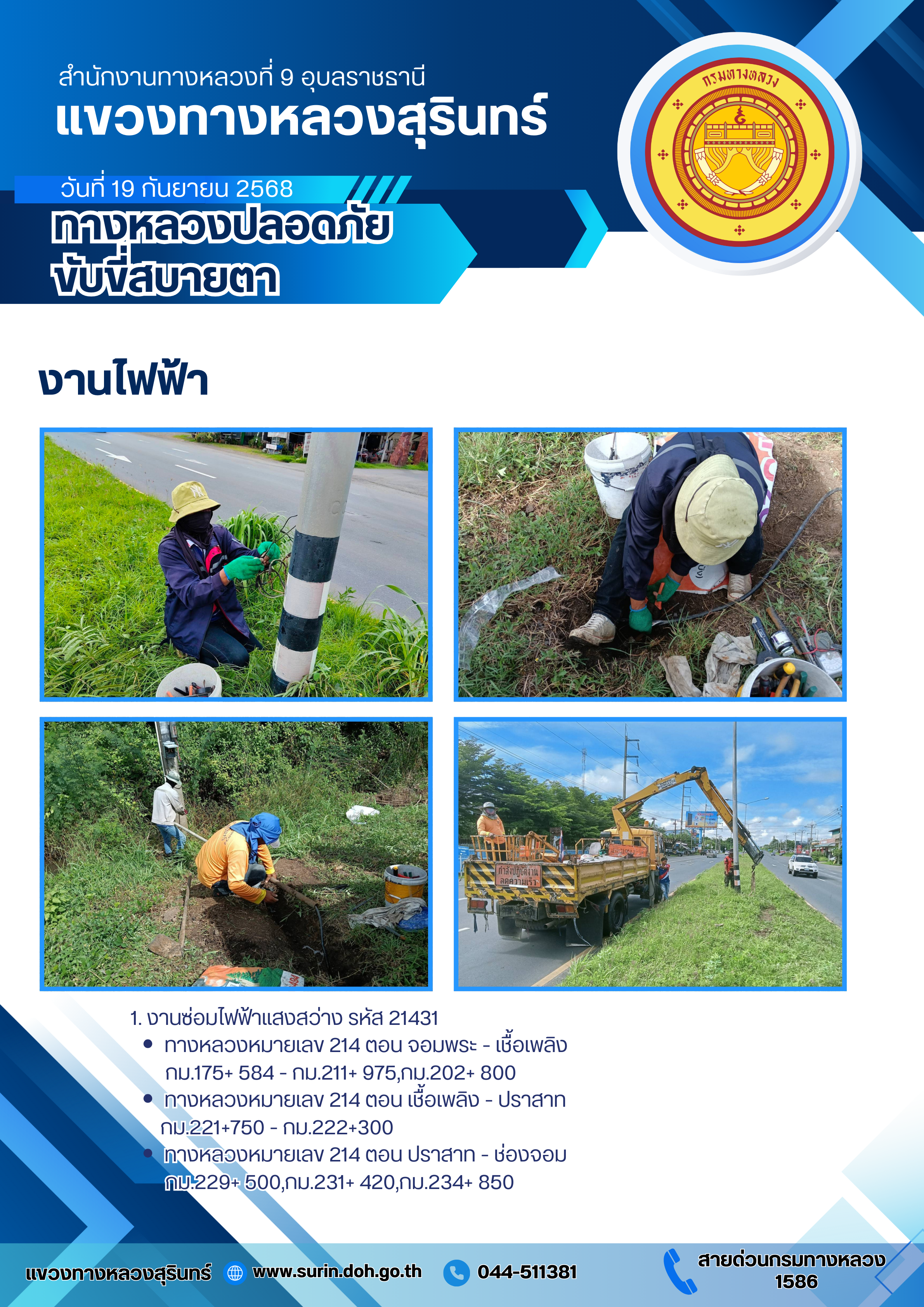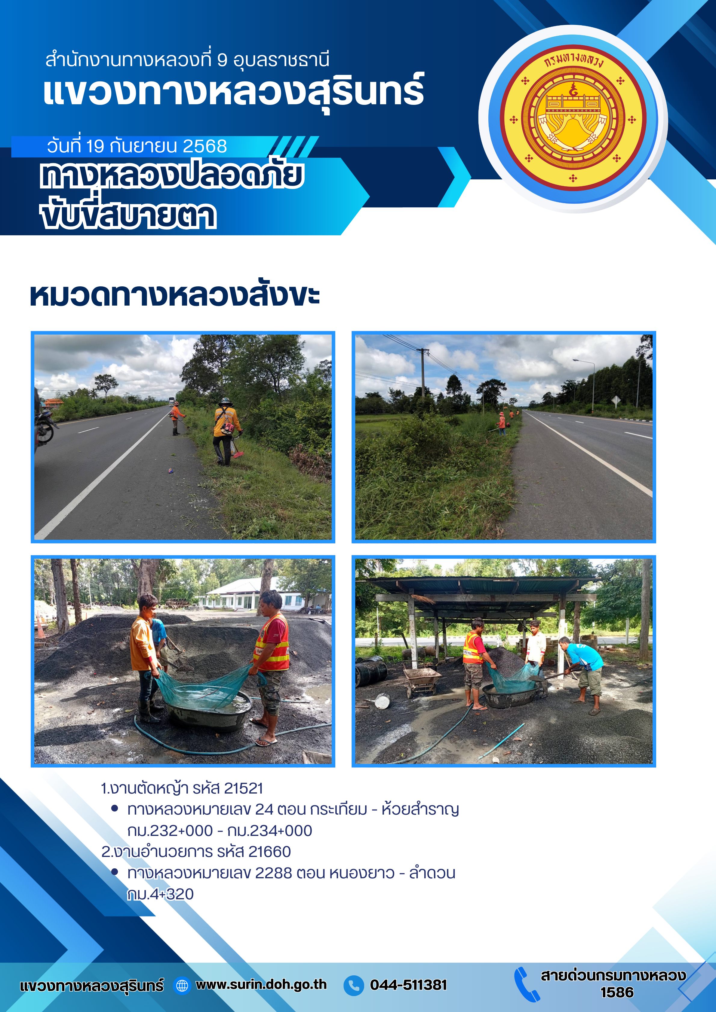 ข้อมูลข่าว : ทางหลวงปลอดภัย ขับขี่สบายตา 19 กันยายน 2568