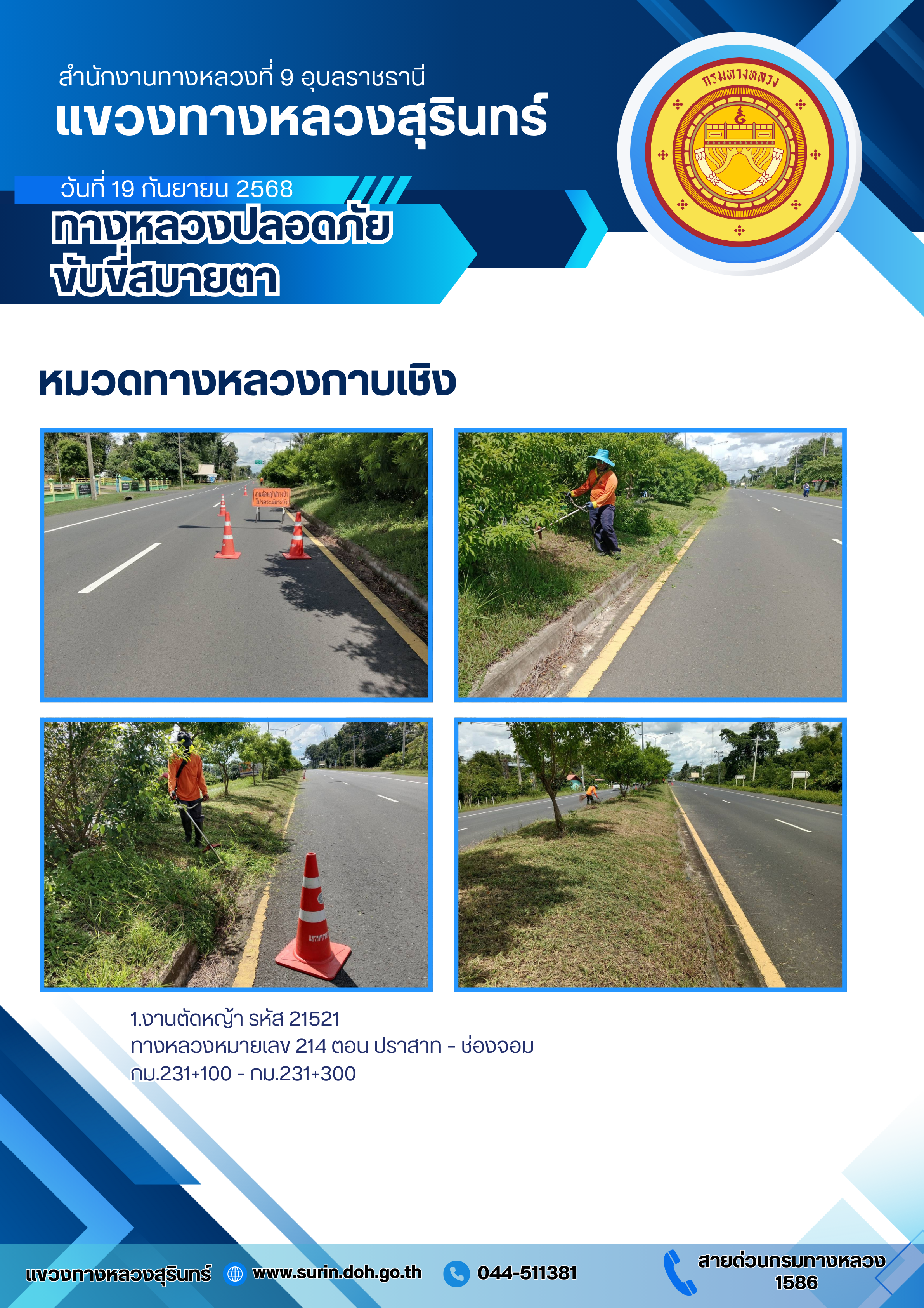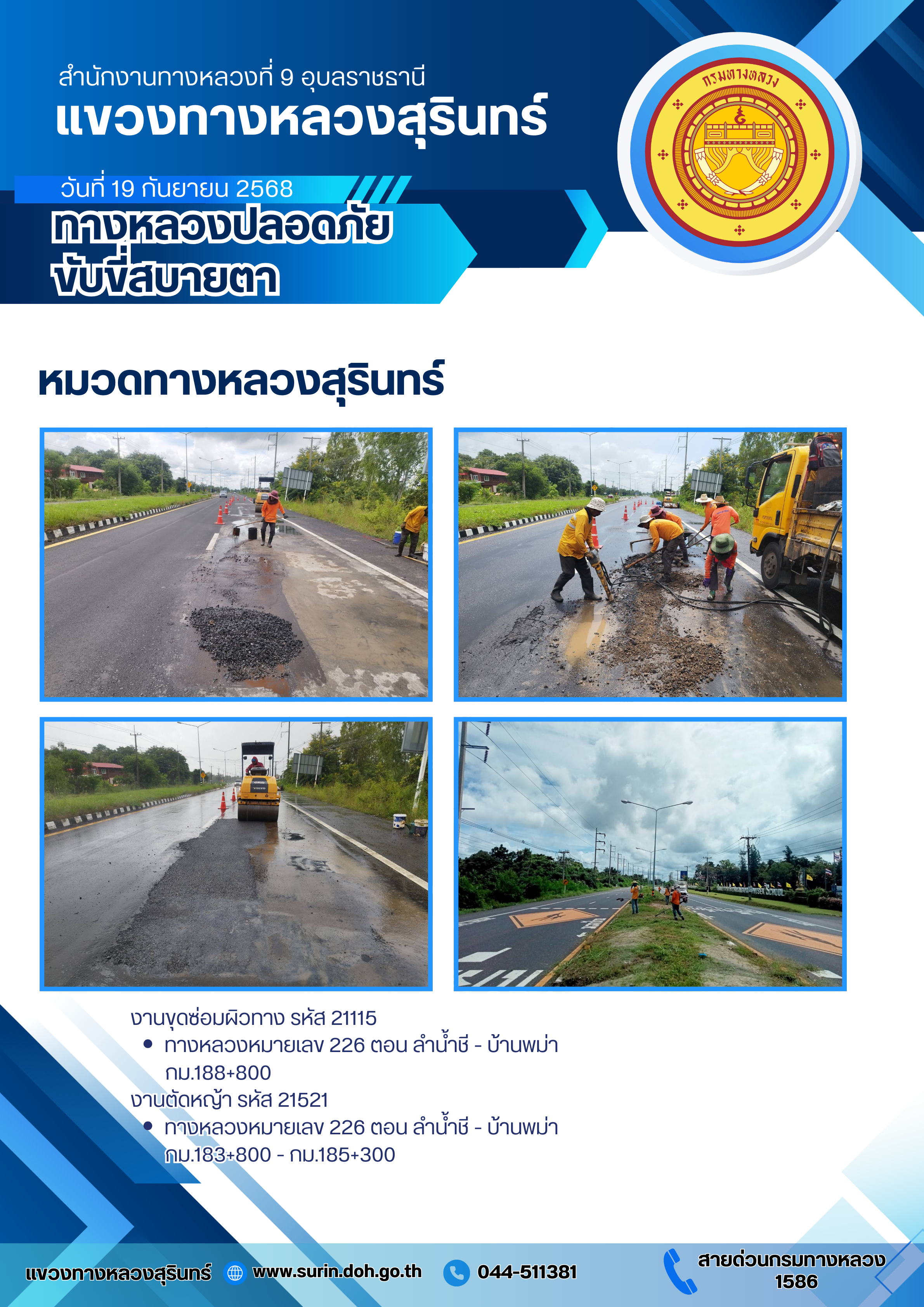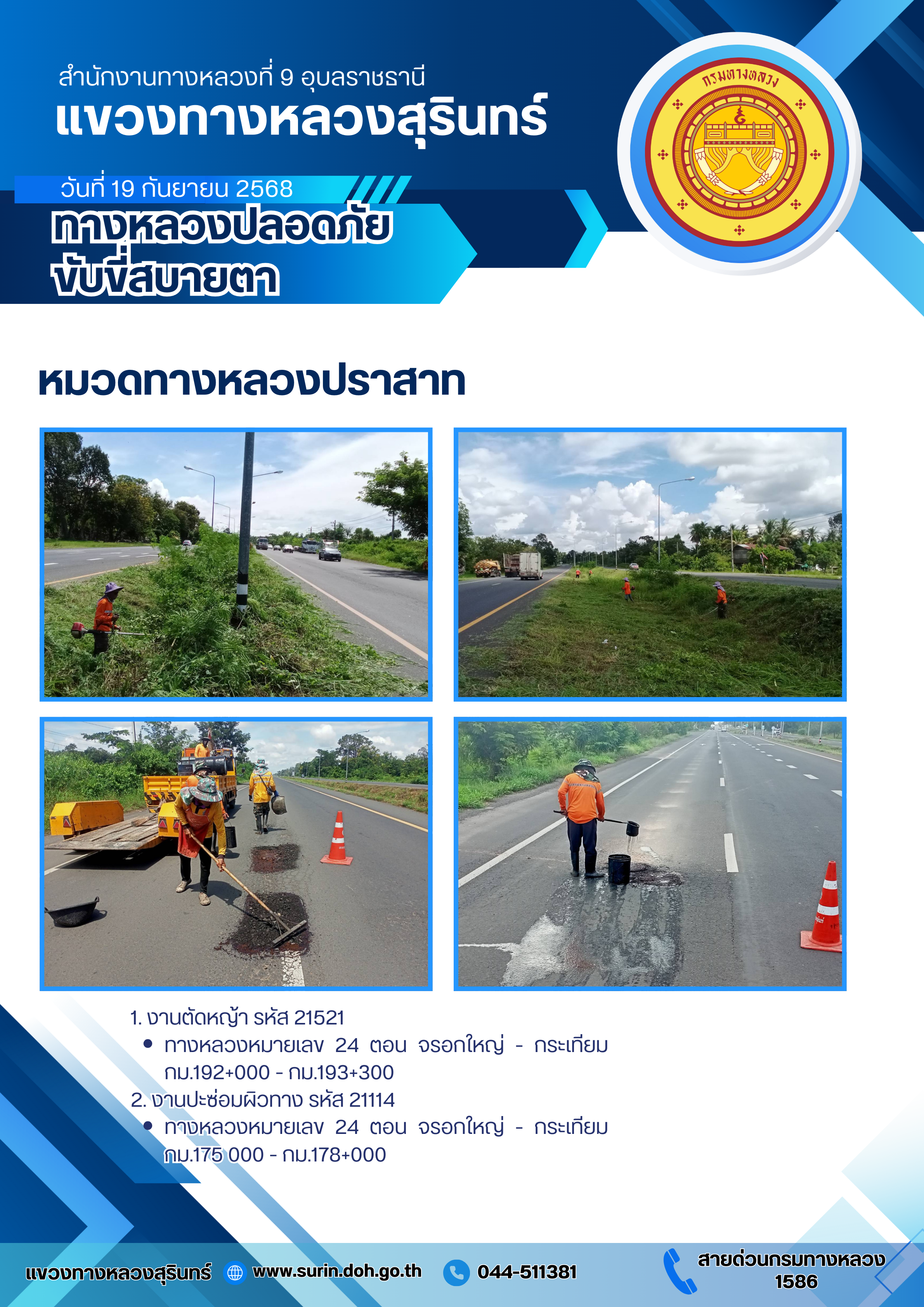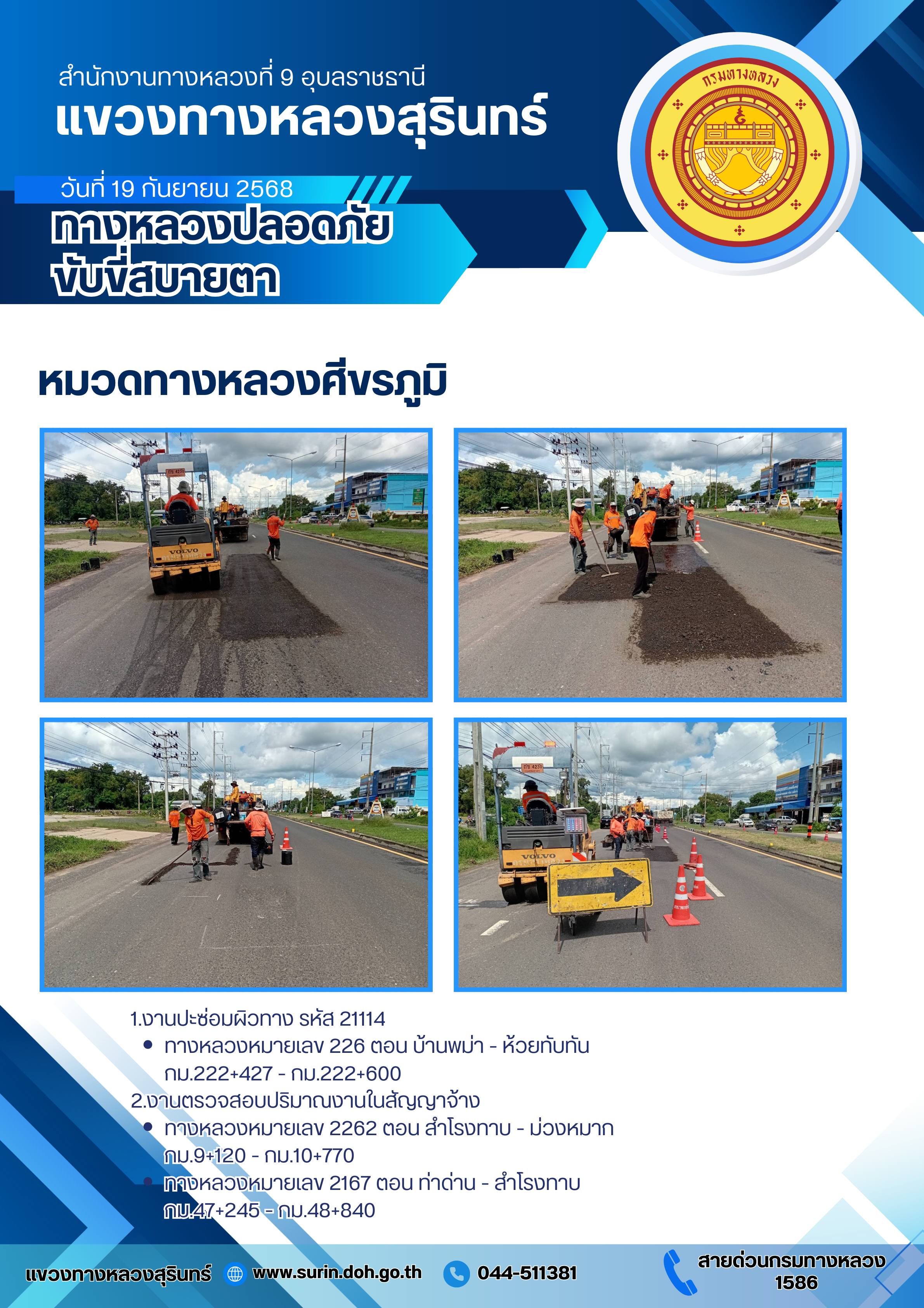 ข้อมูลข่าว : ทางหลวงปลอดภัย ขับขี่สบายตา 19 กันยายน 2568