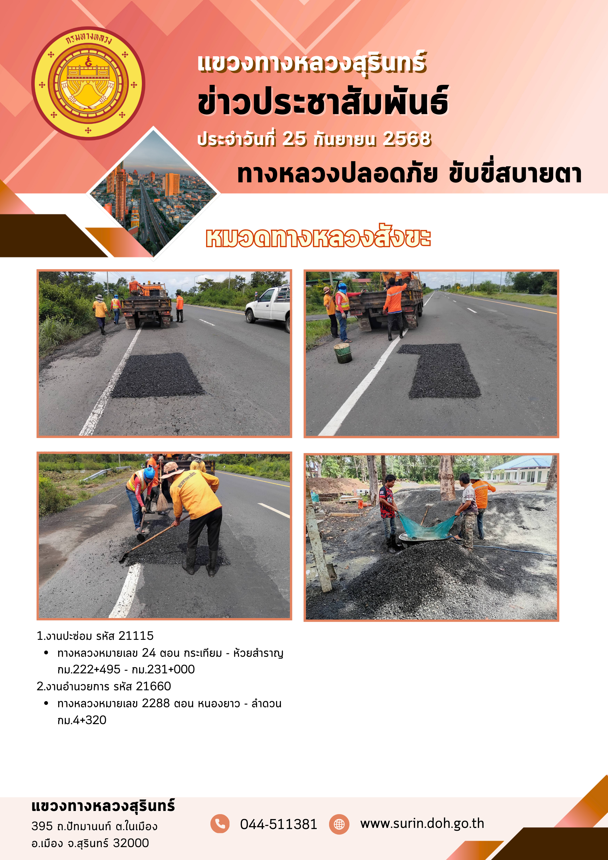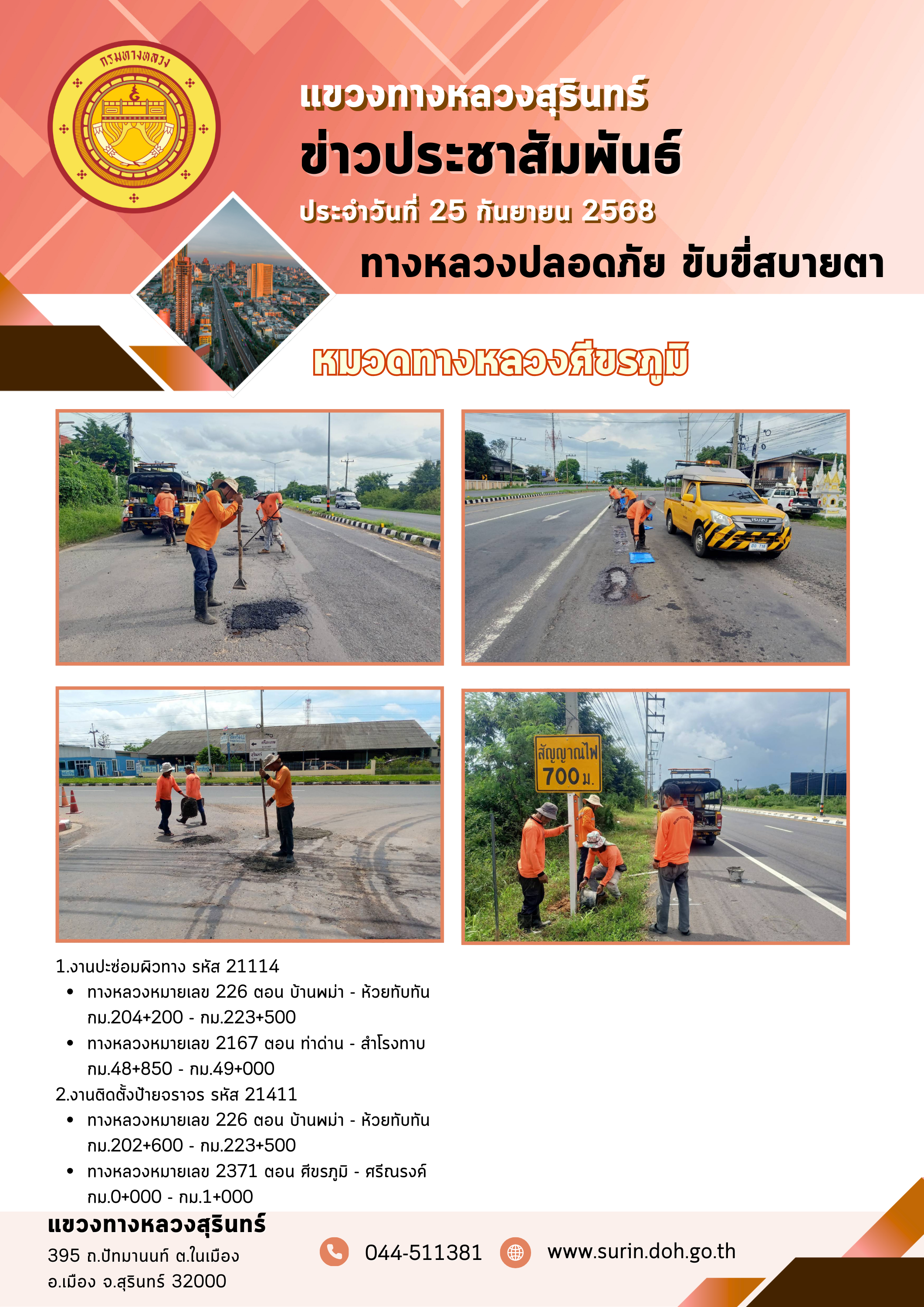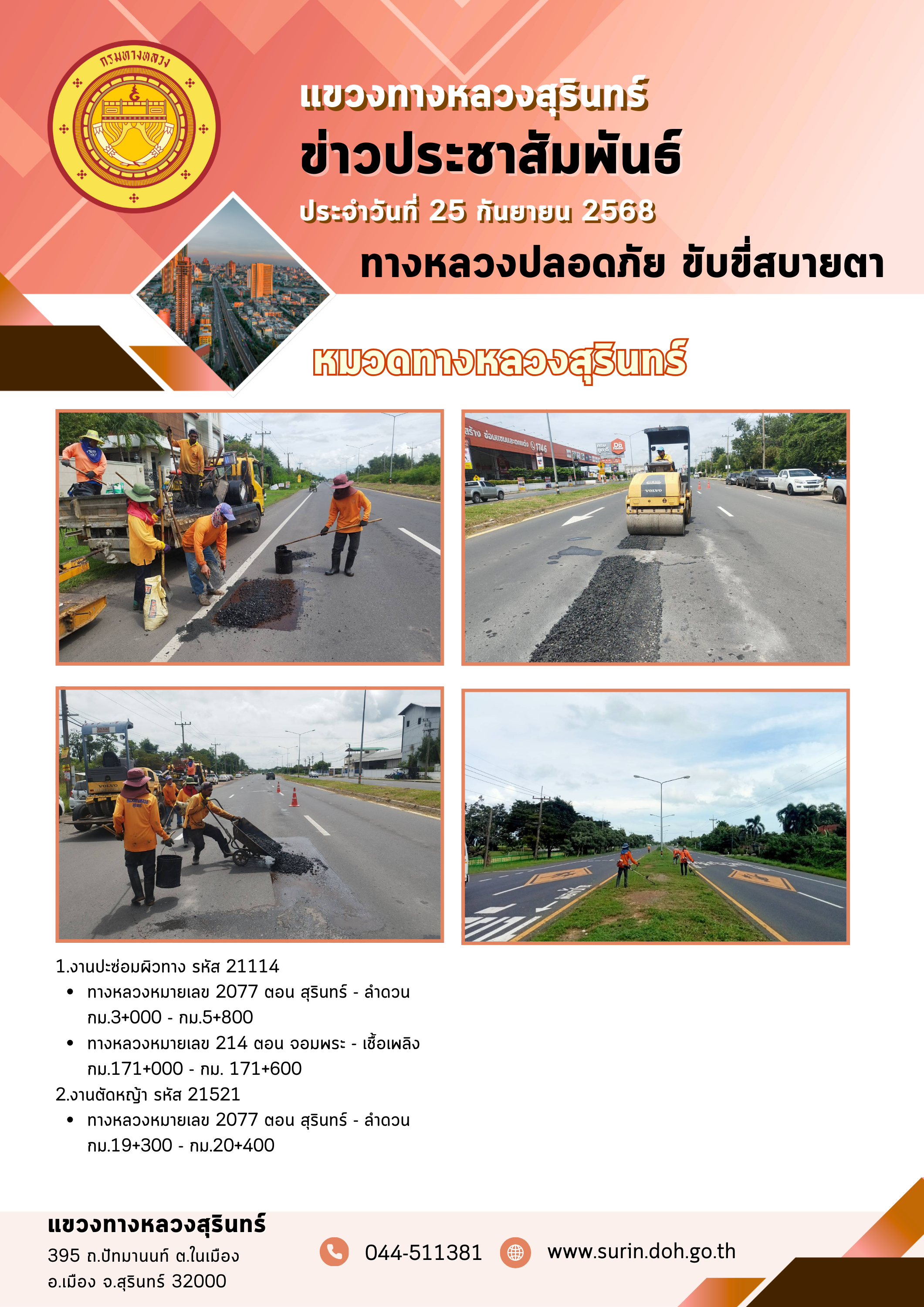 ข้อมูลข่าว : ทางหลวงปลอดภัย ขับขี่สบายตา 25 กันยายน 2568