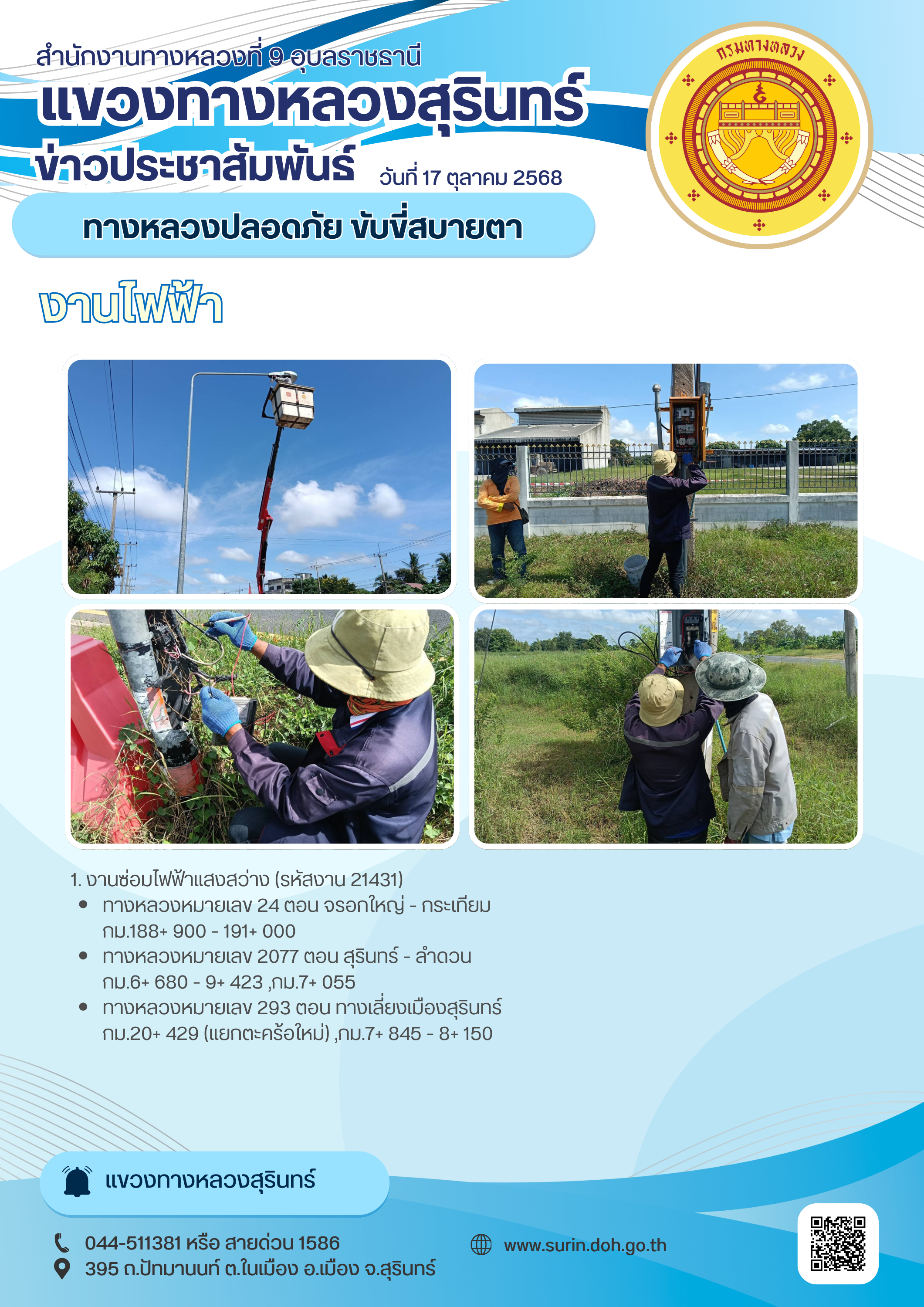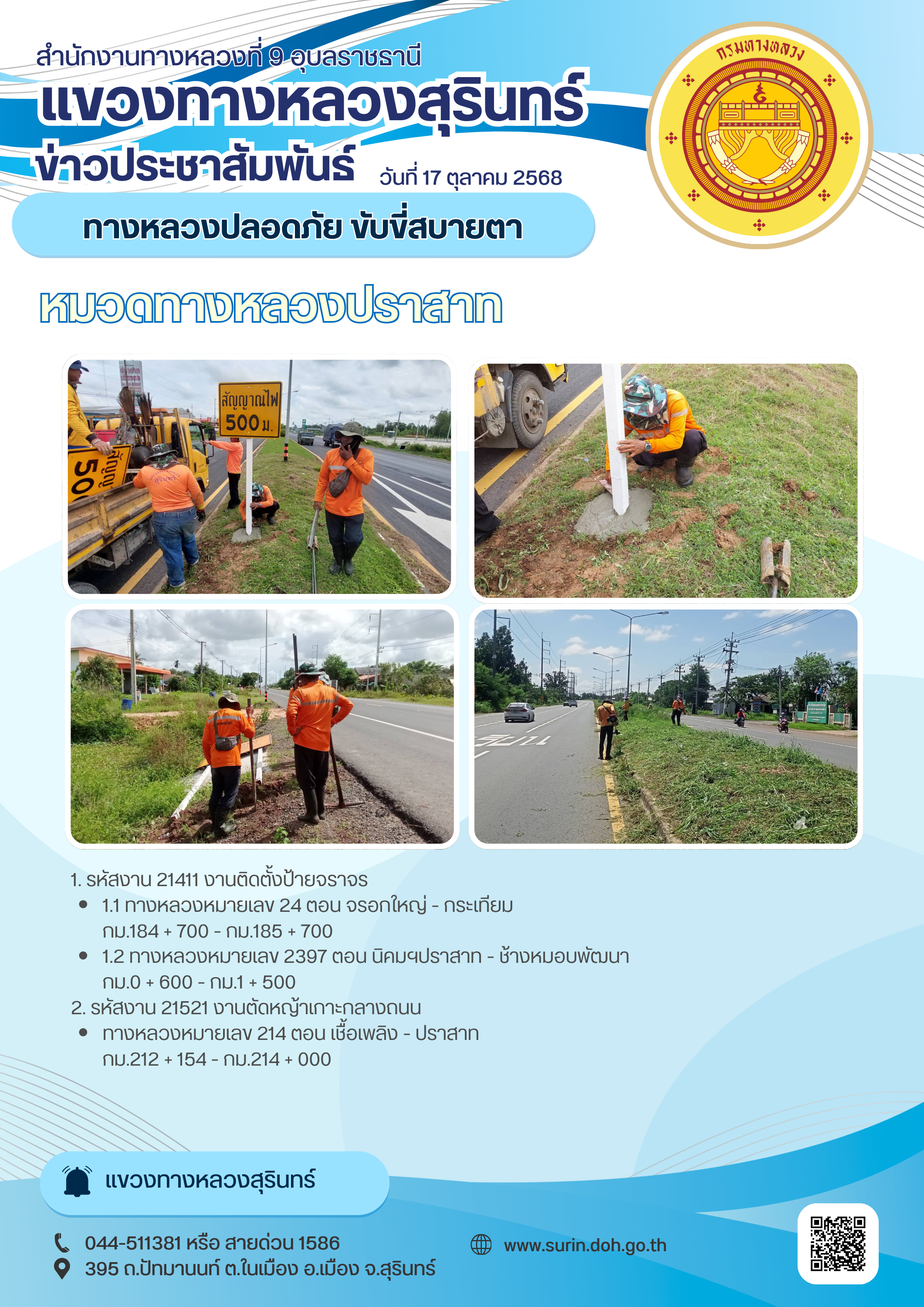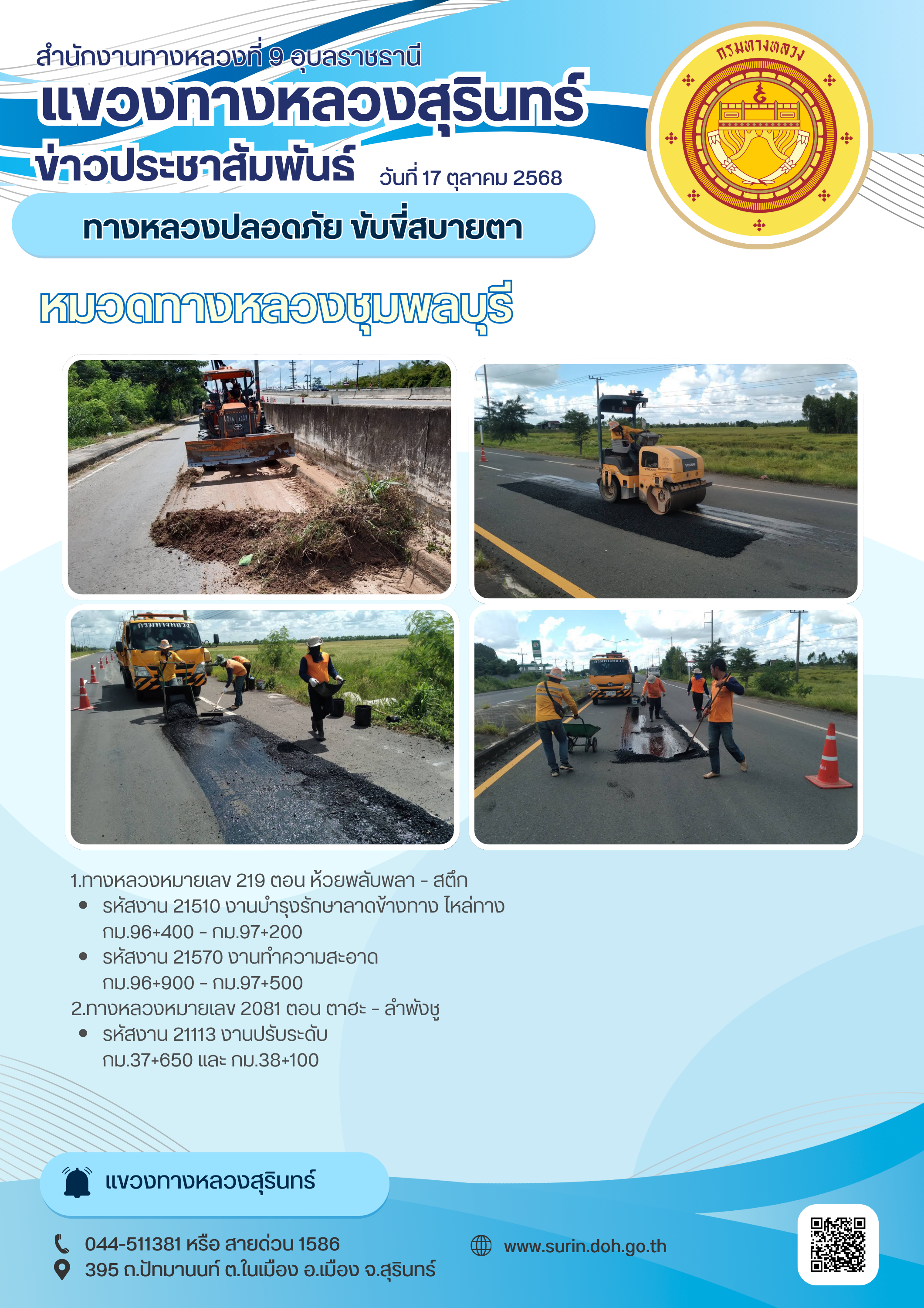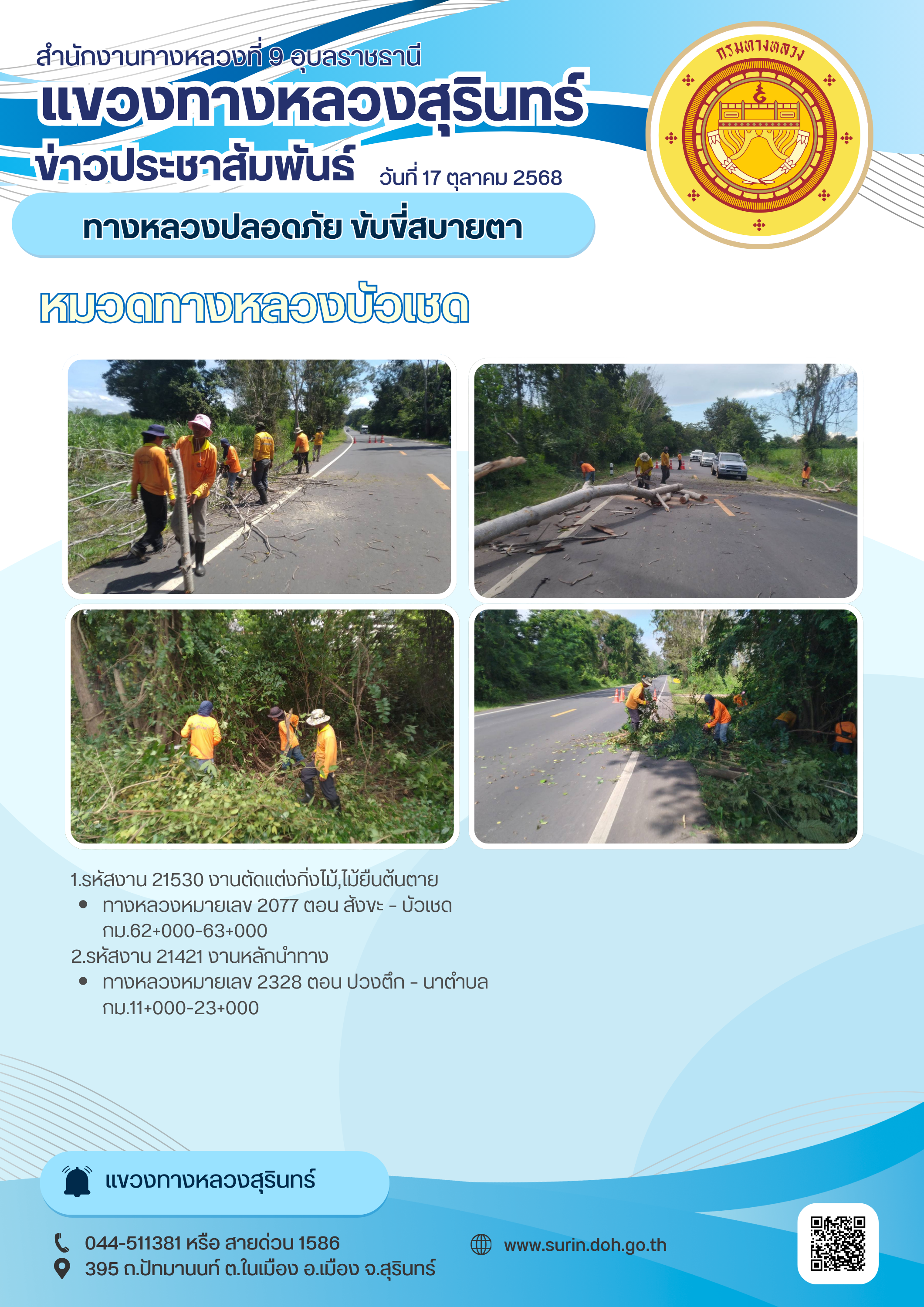 ข้อมูลข่าว : ทางหลวงปลอดภัย ขับขี่สบายตา 17 ตุลาคม 2568
