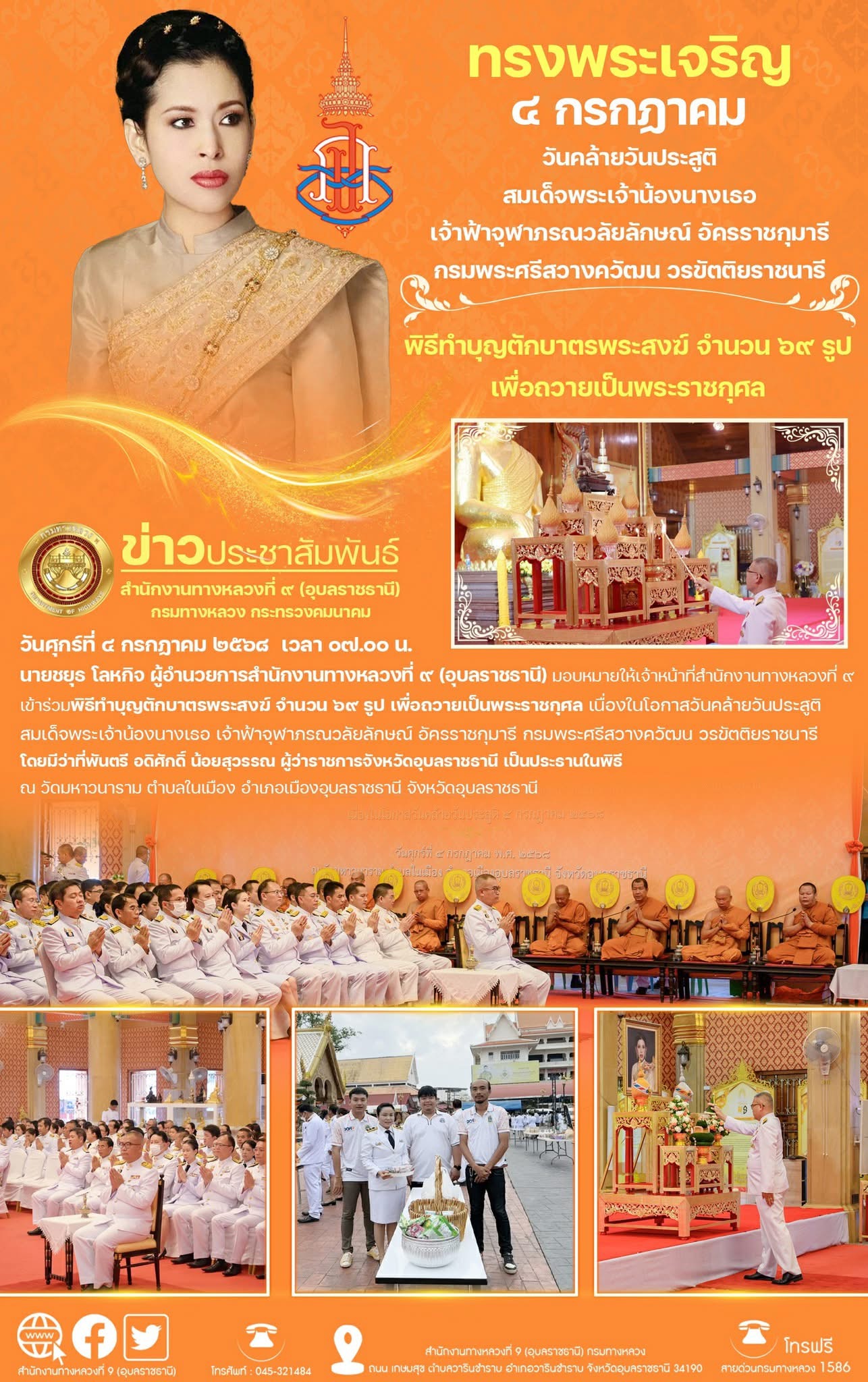 ร่วมพิธีทำบุญตักบาตร เนื่องในโอกาสวันคล้ายวันประสูติสมเด็จพระเจ้าน้องนางเธอ เจ้าฟ้าจุฬาภรณวลัยลักษณ์ อัครราชกุมารี กรมพระศรีสวางควัฒน วรขัตติยราช?นารี