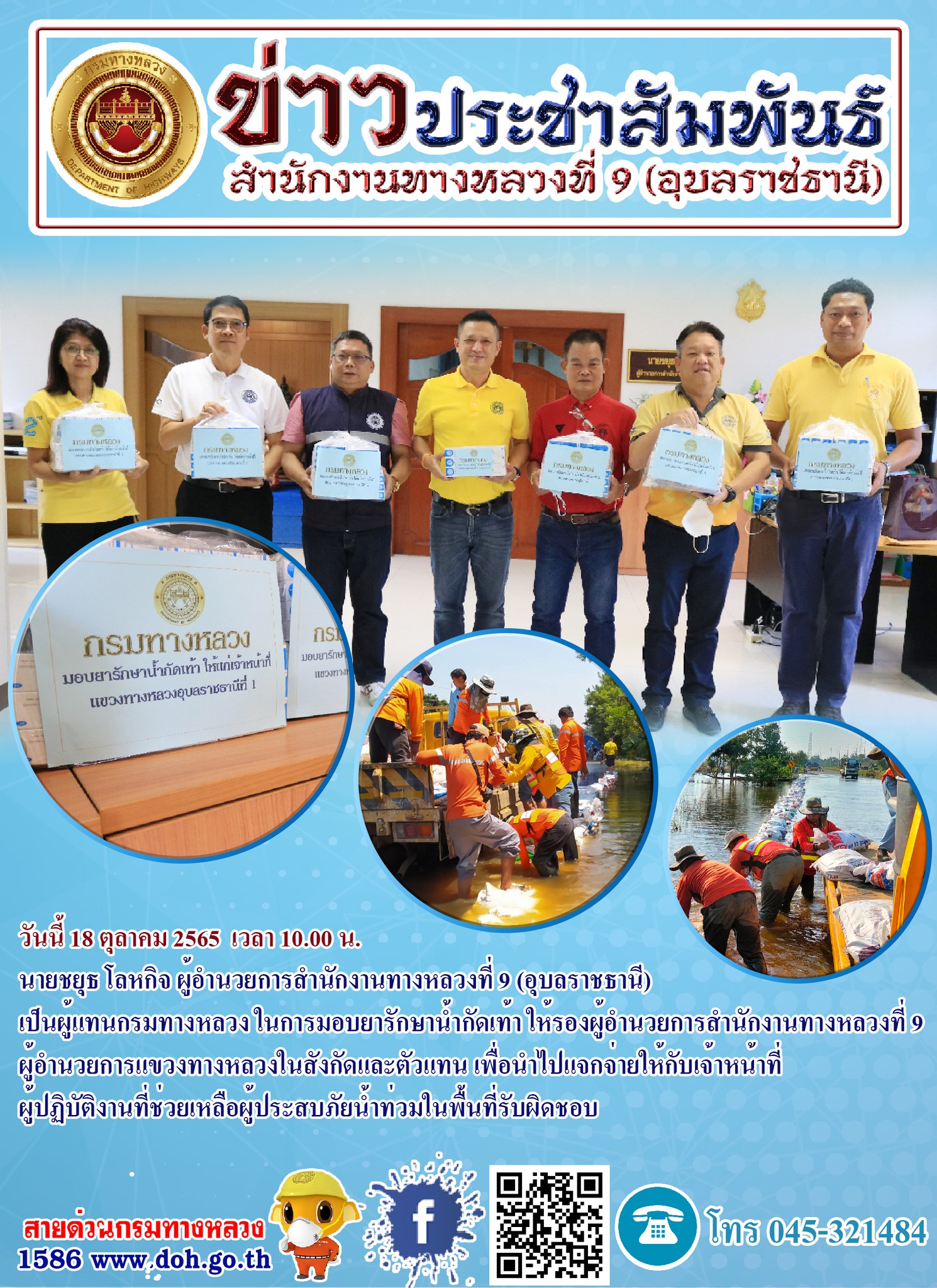 วันนี้ 18 ตุลาคม 2565 เวลา 10.00 น. นายชยุธ โลหกิจ ผู้อำนวยการสำนักงานทางหลวงที่ 9 (อุบลราชธานี) เป็นผู้แทนกรมทางหลวง ในการมอบยารักษาน้ำกัดเท้า ให้รองผู้อำนวยการสำนักงานทางหลวงที่ 9 ผู้อำนวยการแขวงทางหลวงในสังกัดและตัวแทน เพื่อนำไปแจกจ่ายให้กับเจ้าหน้าที่ผู้ปฏิบัติงานที่ช่วยเหลือผู้ประสบภัยน้ำท่วมในพื้นที่รับผิดชอบ