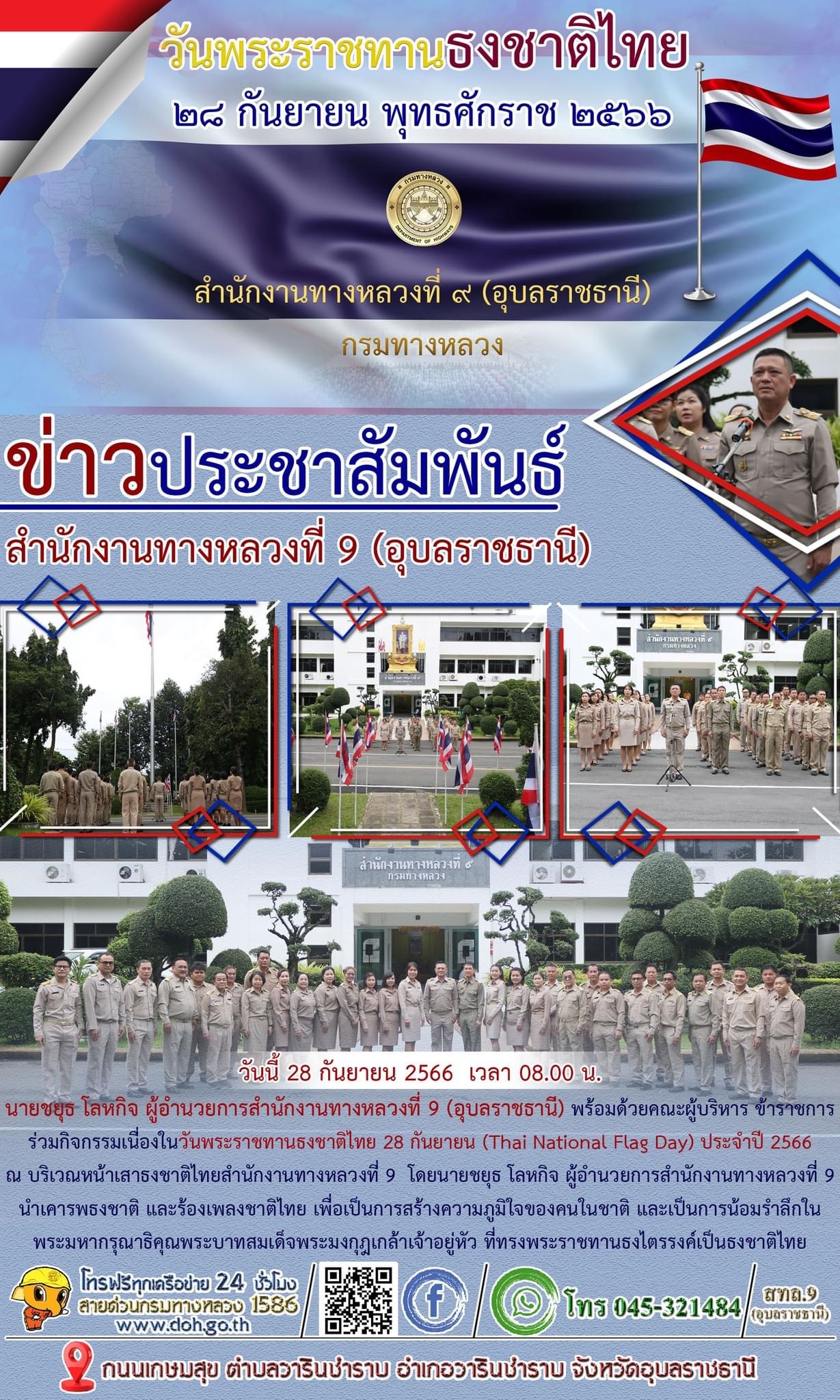 วันนี้ 28 กันยายน 2566 เวลา 08.00 น. นายชยุธ โลหกิจ ผู้อำนวยการสำนักงานทางหลวงที่ 9 (อุบลราชธานี) พร้อมด้วยคณะผู้บริหาร ข้าราชการร่วมกิจกรรมเนื่องในวันพระราชทานธงชาติไทย 28 กันยายน (Thai National Flag Day) ประจำปี 2566 ณ บริเวณหน้าเสาธงชาติไทยสำนักงานทางหลวงที่ 9 โดยนายชยุธ โลหกิจ ผู้อำนวยการสำนักงานทางหลวงที่ 9นำเคารพธงชาติ และร้องเพลงชาติไทย เพื่อเป็นการสร้างความภูมิใจของคนในชาติ และเป็นการน้อมรำลึกในพระมหากรุณาธิคุณพระบาทสมเด็จพระมงกุฎเกล้าเจ้าอยู่หัว ที่ทรงพระราชทานธงไตรรงค์เป็นธงชาติไทย