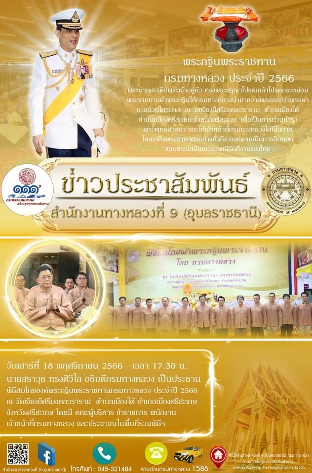 วันเสาร์ที่ 18 พฤศจิกายน 2566 เวลา 17.30 น. นายสราวุธ ทรงศิวิไล อธิบดีกรมทางหลวง เป็นประธานพิธีสมโภชองค์พระกฐินพระราชทานกรมทางหลวง ประจำปี 2566 ณ วัดเจียงอีศรีมงคลวราราม ตำบลเมืองใต้ อำเภอเมืองศรีสะเกษ จังหวัดศรีสะเกษ โดยมี คณะผู้บริหาร ข้าราชการ พนักงานเจ้าหน้าที่กรมทางหลวง และประชาชนในพื้นที่ร่วมพิธีฯ