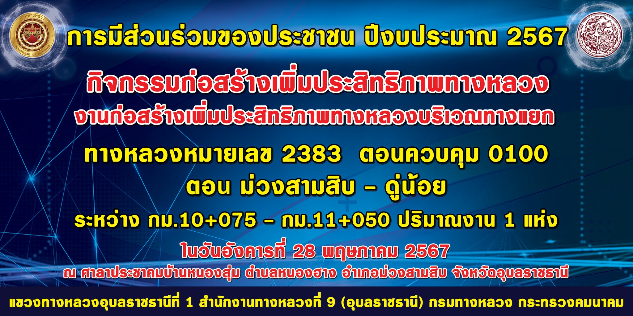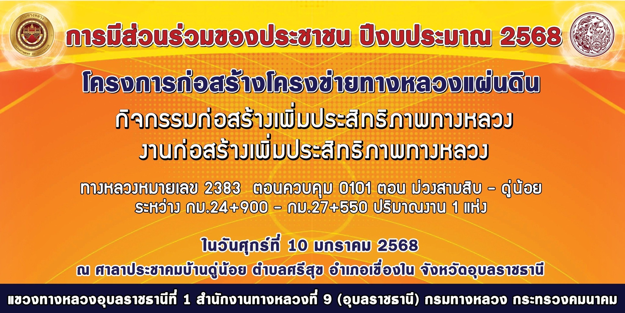 การประชุมการมีส่วนร่วมของประชาชน ปีงบประมาณ 2568 โครงการก่อสร้างโครงข่ายทางหลวงแผ่นดิน กิจกรรมก่อสร้างเพิ่มประสิทธิภาพทางหลวง งานก่อสร้างเพิ่มประสิทธิภาพทางหลวง ทางหลวงหมายเลข 2383 ตอนควบคุม 0101 ตอน ม่วงสามสิบ - ดู่น้อย ระหว่าง กม.24+900 - กม.27+550 ปริมาณงาน 1 แห่ง ในวันศุกร์ที่ 10 มกราคม 2568 เวลา 09.00 น. - 12.00 น.