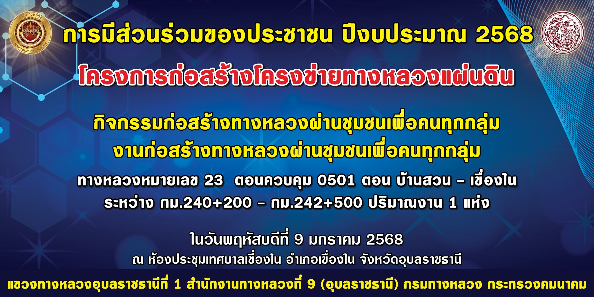 แขวงทางหลวงอุบลราชธานีที่ 1 ขอเชิญประชาชนผู้สนใจเข้าร่วมรับฟังและแสดงความ คิดเห็น “การประชุมการมีส่วนร่วมของประชาชน ปีงบประมาณ 2568 กิจกรรมก่อสร้างทางหลวงชุมชนเพื่อคนทุกกลุ่ม ทางหลวงหมายเลข 23 ตอนควบคุม 0501 ตอน บ้านสวน - เขื่องใน ระหว่าง กม.240+300 - กม.242+229 ปริมาณงาน 1 แห่ง ในวันพฤหัสบดีที่ 9 มกราคม 2568 เวลา 09.00 น. - 12.00 น. ณ ห้องประชุมเทศบาลเขื่องใน ตำบลเขื่องใน อำเภอเขื่องใน จังหวัดอุบลราชธานี