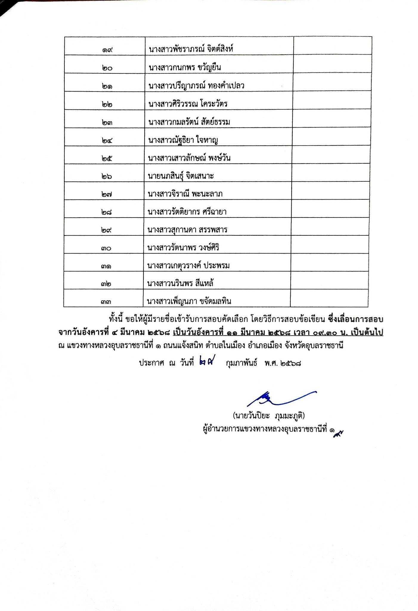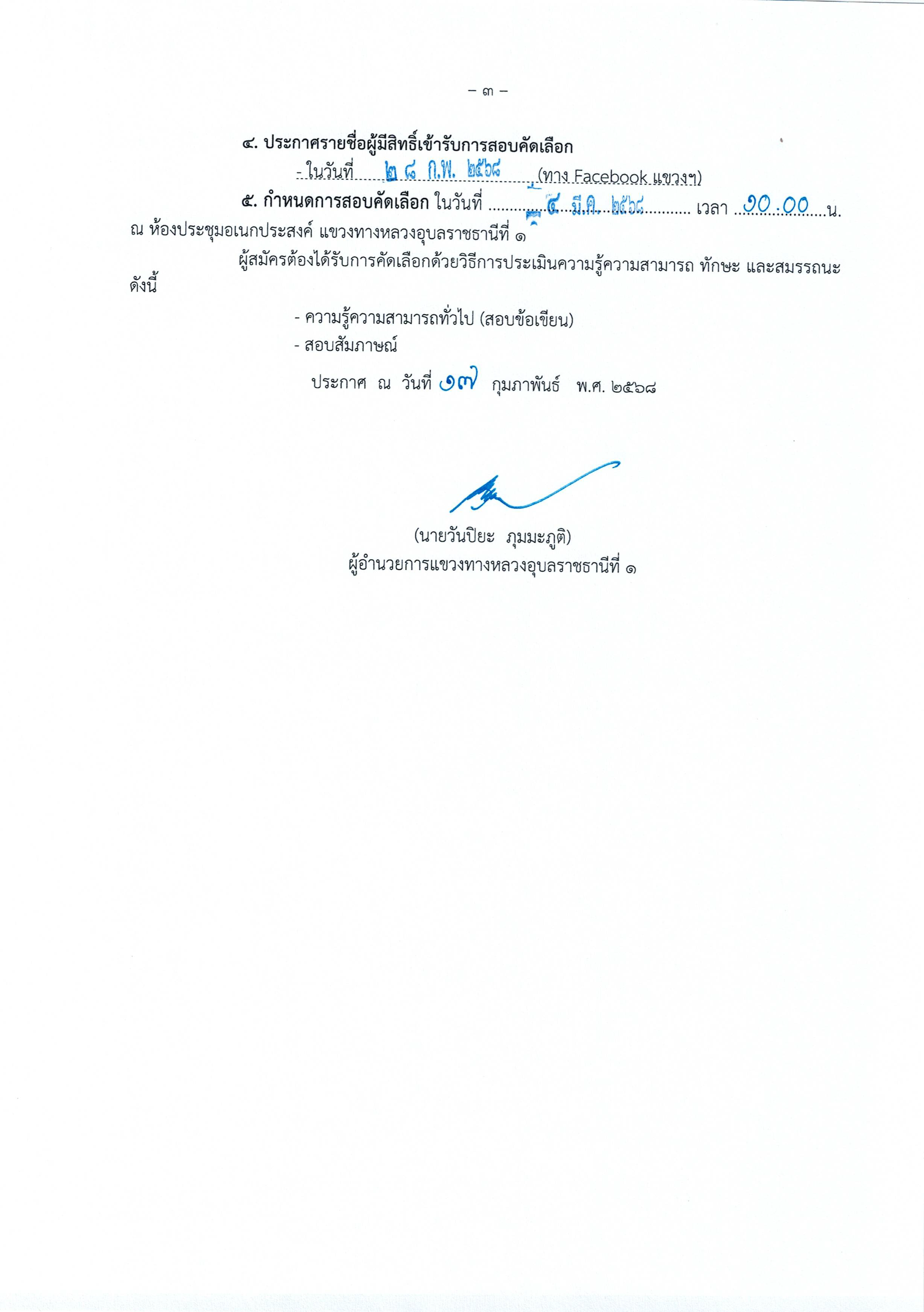 แขวงทางหลวงอุบลราชธานีที่ 1 ประกาศรายชื่อผู้มีสิทธิ์เข้ารับการสอบคัดเลือกเพื่อเป็นลูกจ้างชั่วคราว ขอให้ผู้ที่มีรายชื่อเข้ารับการสอบคัดเลือกโดยวิธีการสอบข้อเขียน ซึ่งเลื่อนการสอบจากวันอังคารที่ 4 มีนาคม 2568 เป็นวันอังคารที่ 11 มีนาคม 2568 เวลา 09.30 น เป็นต้นไป