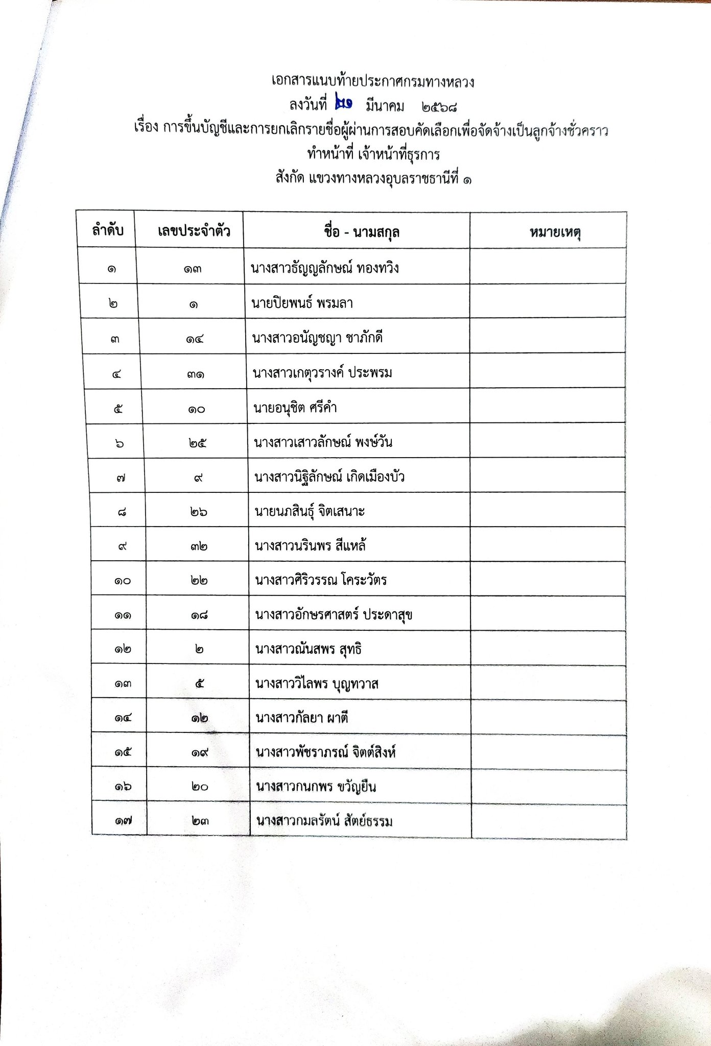 แขวงทางหลวงอุบลราชธานีที่ 1 ประกาศรายชื่อผู้สอบผ่านการคัดเลือกเเละขึ้นบัญชีเพื่อเป็นลูกจ้างชั่วคราว