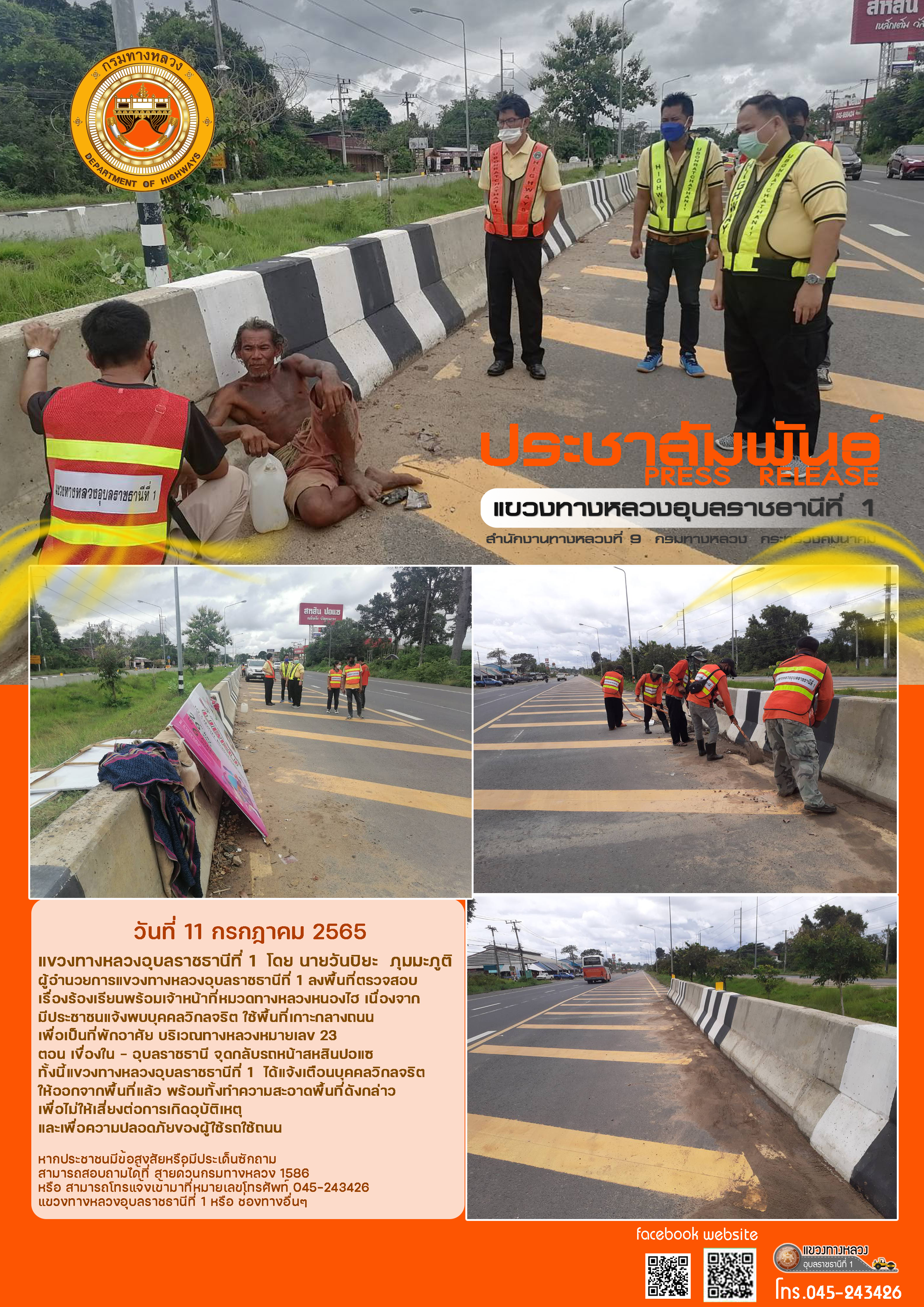 โดย นายวันปิยะ ภุมมะภูติ ผู้อำนวยการแขวงทางหลวงอุบลราชธานีที่ 1 ลงพื้นที่ตรวจสอบเรื่องร้องเรียนพร้อมเจ้าหน้าที่หมวดทางหลวงหนองไฮ เนื่องจากมีประชาชนแจ้งพบบุคคลวิกลจริต ใช้พื้นที่เกาะกลางถนน เพื่อเป็นที่พักอาศัย บริเวณทางหลวงหมายเลข 23 ตอน เขื่องใน - อุบลราชธานี จุดกลับรถหน้าสหสินปอแซ ทั้งนี้แขวงทางหลวงอุบลราชธานีที่ 1
