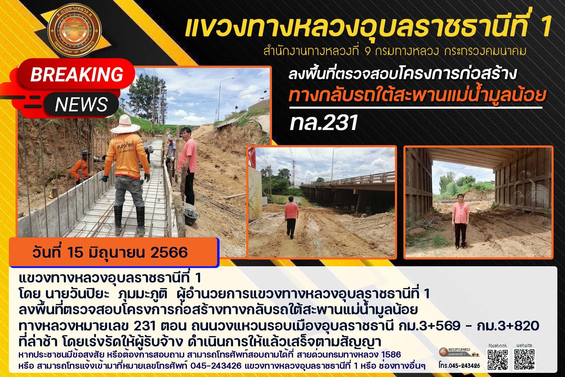 ลงพื้นที่ตรวจสอบโครงการก่อสร้างทางกลับรถใต้สะพานแม่น้ำมูลน้อย ทางหลวงหมายเลข 231 ตอน ถนนวงแหวนรอบเมืองอุบลราชธานี กม.3+569 - กม.3+820
