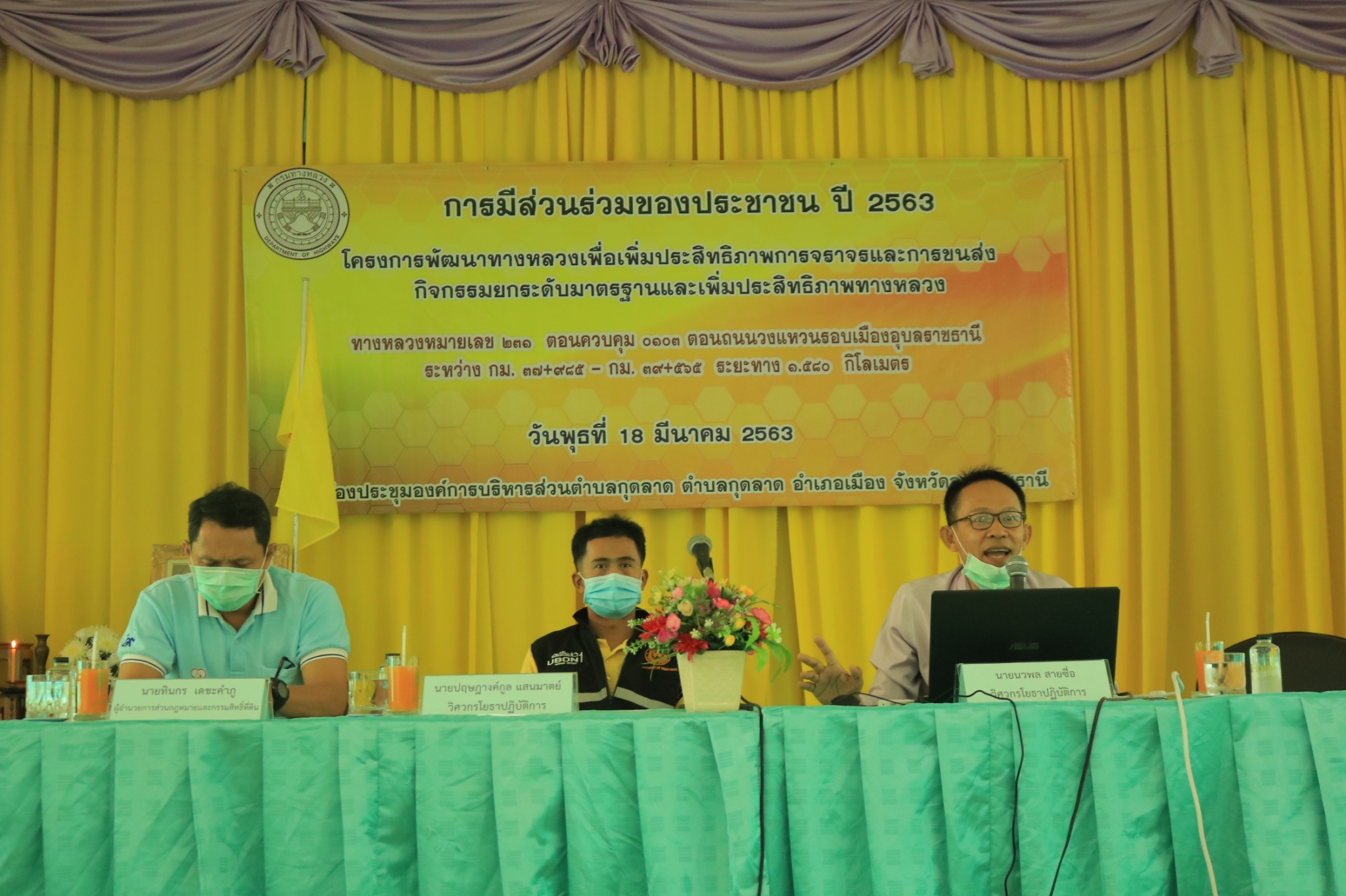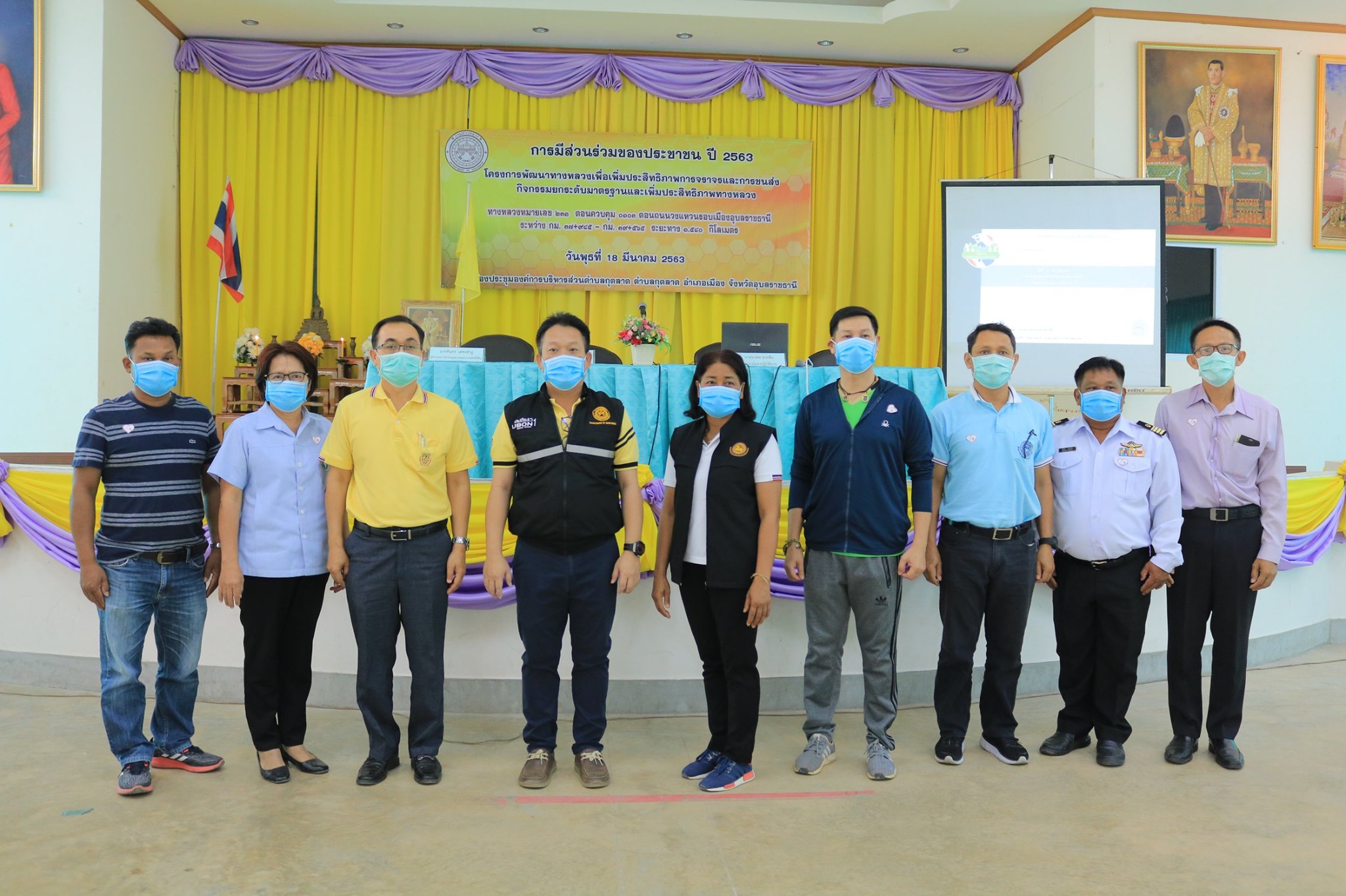 ทั้งนี้ เพื่อความปลอดภัย แขวงทางหลวงอุบลราชธานีที่ 1 ร่วมกับ โรงพยาบาลส่งเสริมสุขภาพตำบลปากน้ำ จัดตั้งจุดคัดกรอง COVID-19 แจกหน้ากากอนามัย และเจลล้างมือ ก่อนเข้าห้องประชุมการมีส่วนร่วมของประชาชน