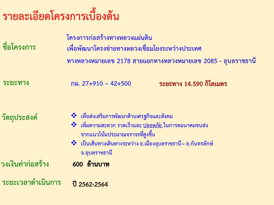 ????เข้าร่วมประชุมรับฟังการชี้แจงรายละเอียดโครงการก่อสร้างทางหลวงแผ่นดิน เพื่อพัฒนาโครงข่ายทางหลวงเชื่อมโยงระหว่างประเทศ ในทางหลวงหมายเลข 2178 สายแยกทางหลวงหมายเลข 2085-อุบลราชธานี ระหว่าง กม.27+910 - กม.42+500 ระยะทาง 14.590 กิโลเมตร