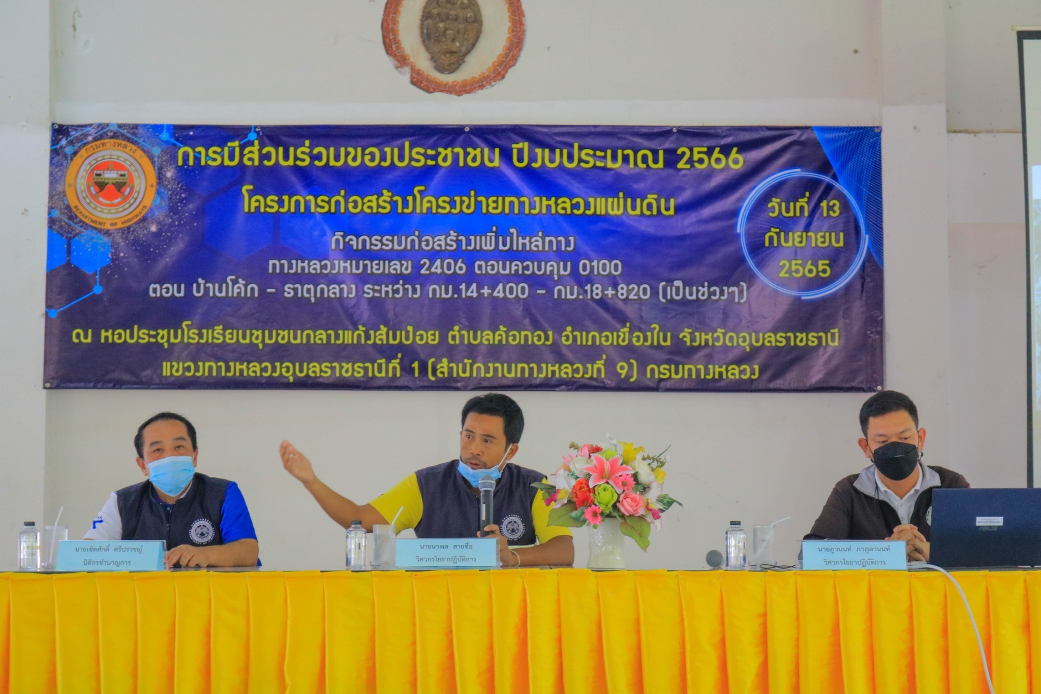 จัดการประชุม การมีส่วนร่วมของประชาชนปี 2566 โครงการก่อสร้างโครงข่ายทางหลวงแผ่นดิน กิจกรรมก่อสร้างเพิ่มไหล่ทางทางหลวงหมายเลข 2406 ตอนควบคุม 0100 ตอน บ้านโค้ก - ธาตุกลางระหว่าง กม.14+400 - กม.18+820 (เป็นช่วงๆ) ปริมาณงาน 1 แห่ง