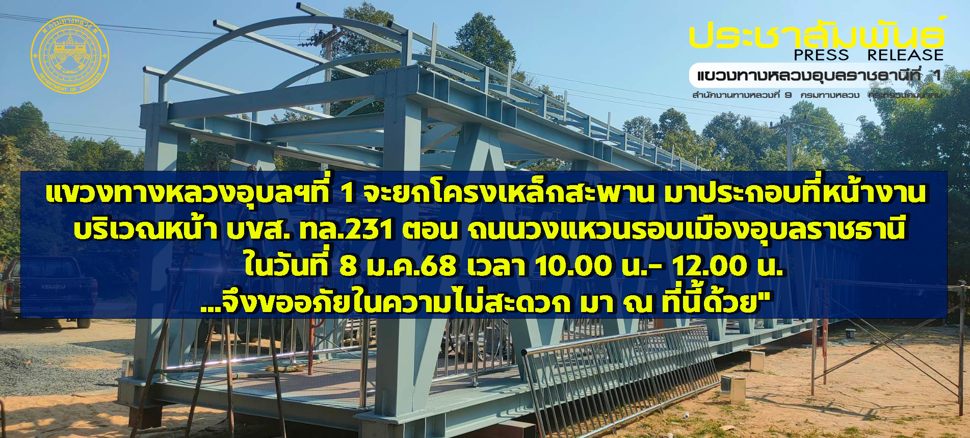 " แขวงทางหลวงอุบลราชธานีที่ 1" จะยกโครงเหล็กสะพาน มาประกอบที่หน้างาน บริเวณหน้า บขส . ทางหลวงหมายเลข 231 ตอน ถนนวงแหวนรอบเมืองอุบลราชธานี