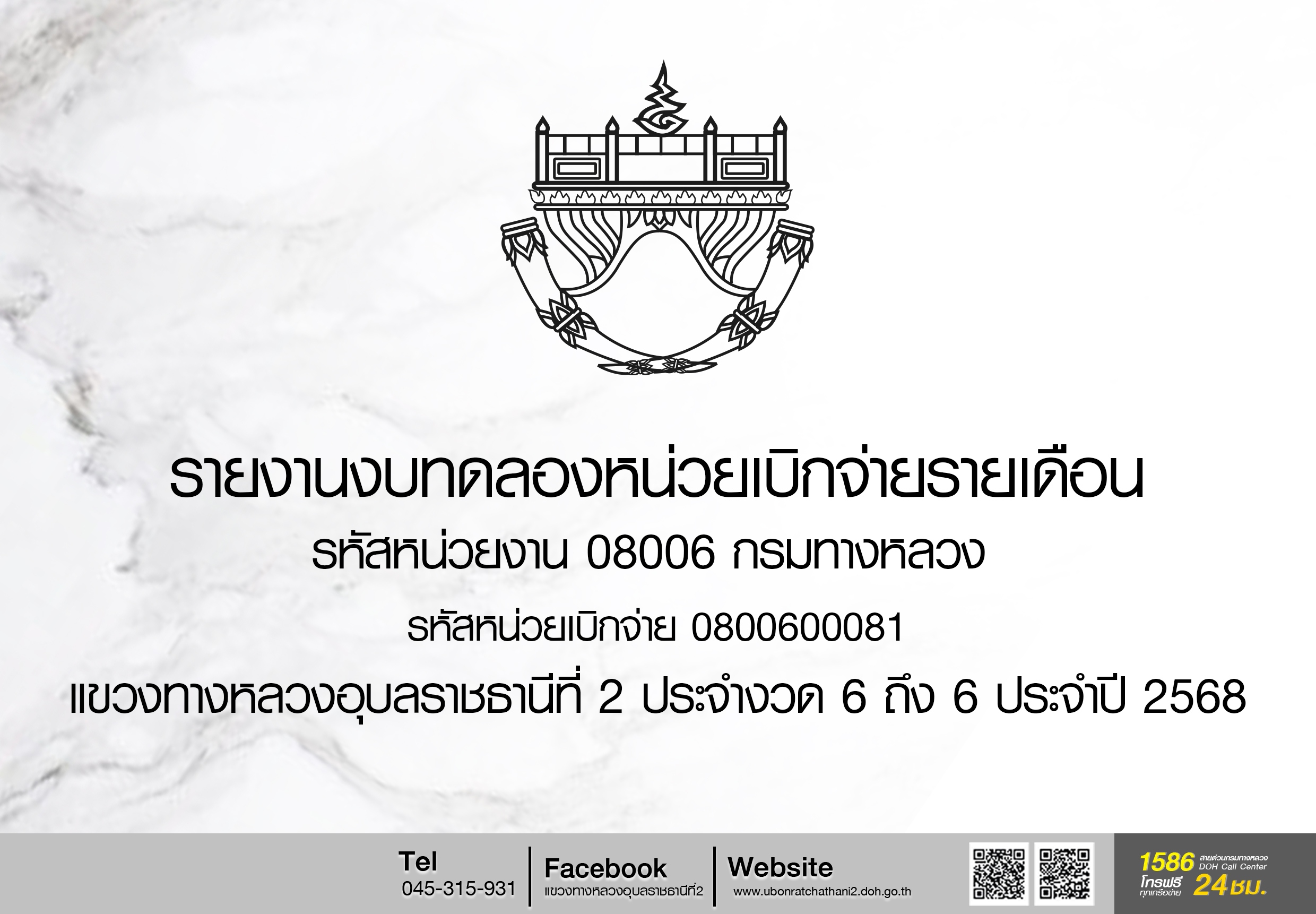 รายงานงบทดลองหน่วยบิกจ่ายรายเดือน รหัสหน่วยงาน 08006 กรมทางหลวง รหัสหน่วยเบิกจ่าย0800600081 ขท อบ 2 ประจำงวด 6 ถึง 6 ประจำปี 2569