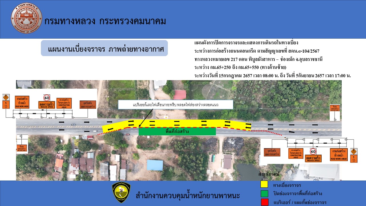 แขวงทางหลวงอุบลราชธานีที่2จะดำเนินการปิดการจราจรบนทางหลวงหมายเลข217 ตอน พิบูลมังสาหาร-ช่องเม็ก ตั้งแต่วันที่ 15 กรกฎาคม 2567-5กันยายน 2567 เพื่อให้ประชาชนผู้ใช้เส้นทางและผู้ที่เกี่ยวข้องได้ทราบ หลีกเลี่ยงการใช้เส้นทางดังกล่าว