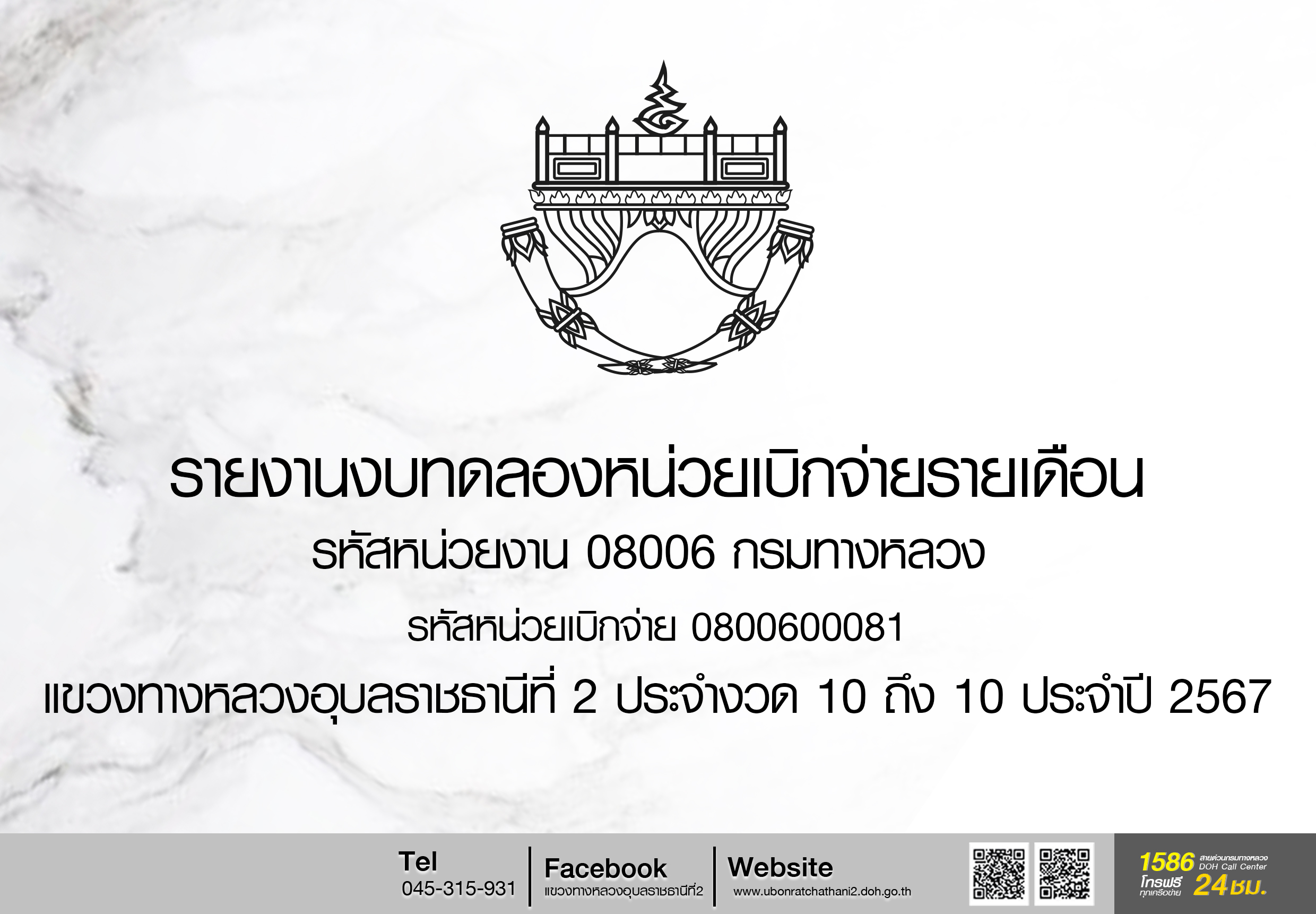 รายงานงบทดลองหน่วยเบิกจ่ายรายเดือน รหัสหน่วยงาน 08006 กรมทางหลวง รหัสหน่วยเบิกจ่าย 0800600081 แขวงทางหลวงอุบลราชธานีที่ 2 ประจำงวด 10 ถึง 10 ประจำปี 2567