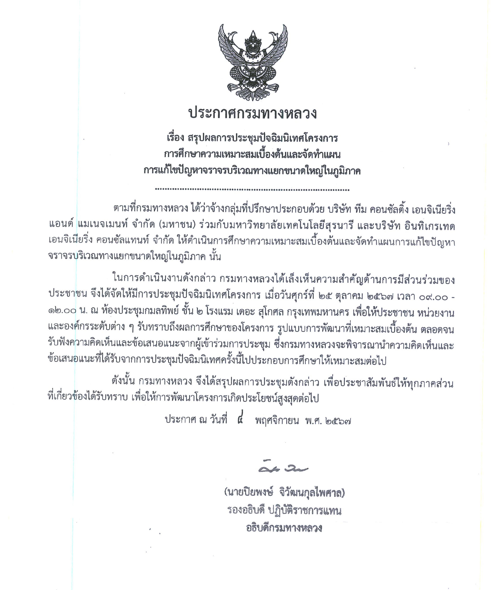 ประกาศผลการประชุมปัจฉิมนิเทศโครงการการศึกษาความเหมาะสมเบื้องต้นและจัดทำแผนการแก้ไขปัญหาจราจรบริเวณทางแยกขนาดใหญ่ในภูมิภาค