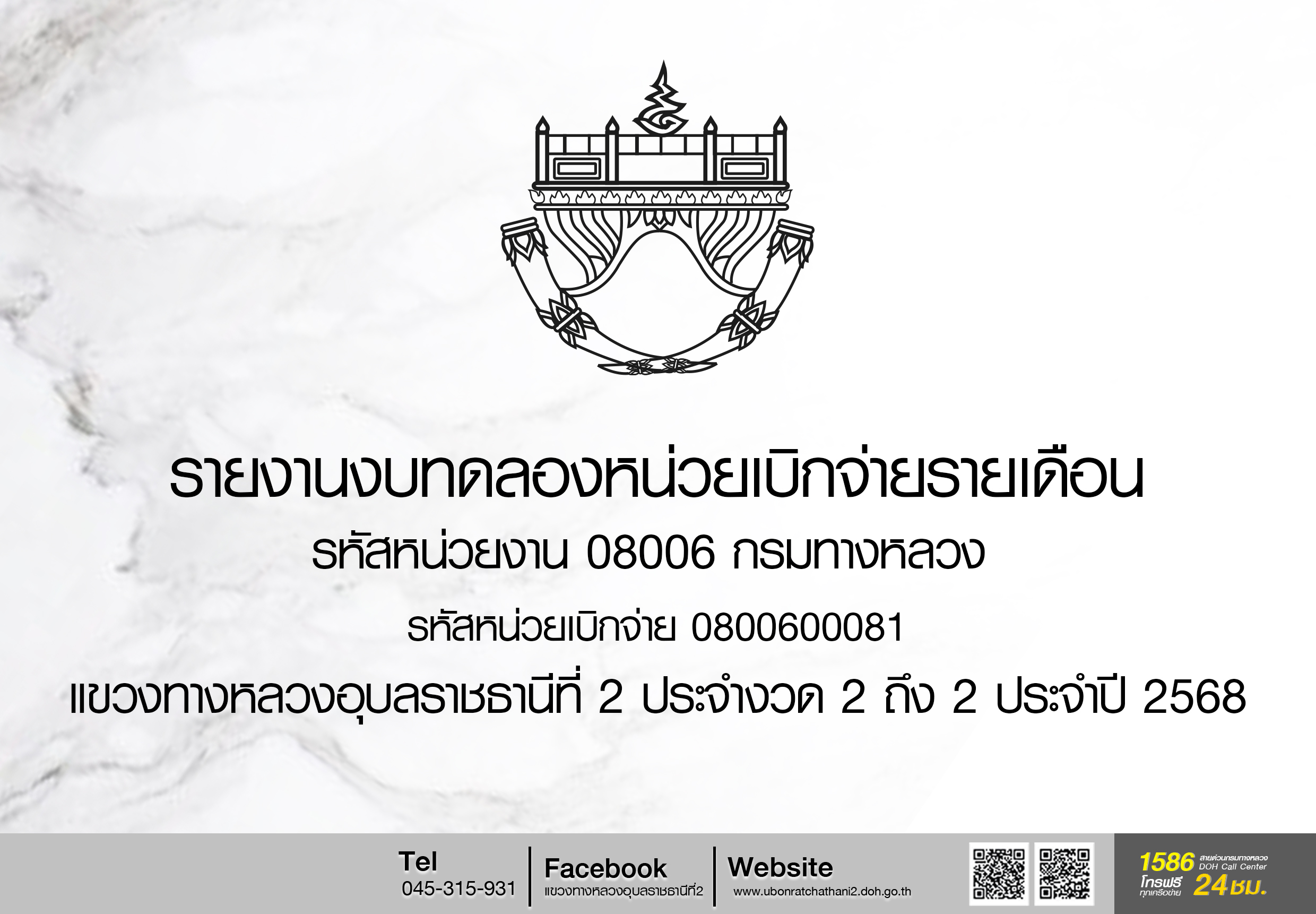 รายงานงบทดลองหน่วยเบิกจ่ายรายเดือนรหัสหน่วยงาน 08006 กรมทางหลวง รหัสหน่วยเบิกจ่าย 0800600081 แขวงทางหลวงอุบลราชธานีที่ 2 ประจำงวด 2 ถึง 2 ประจำปี 2568