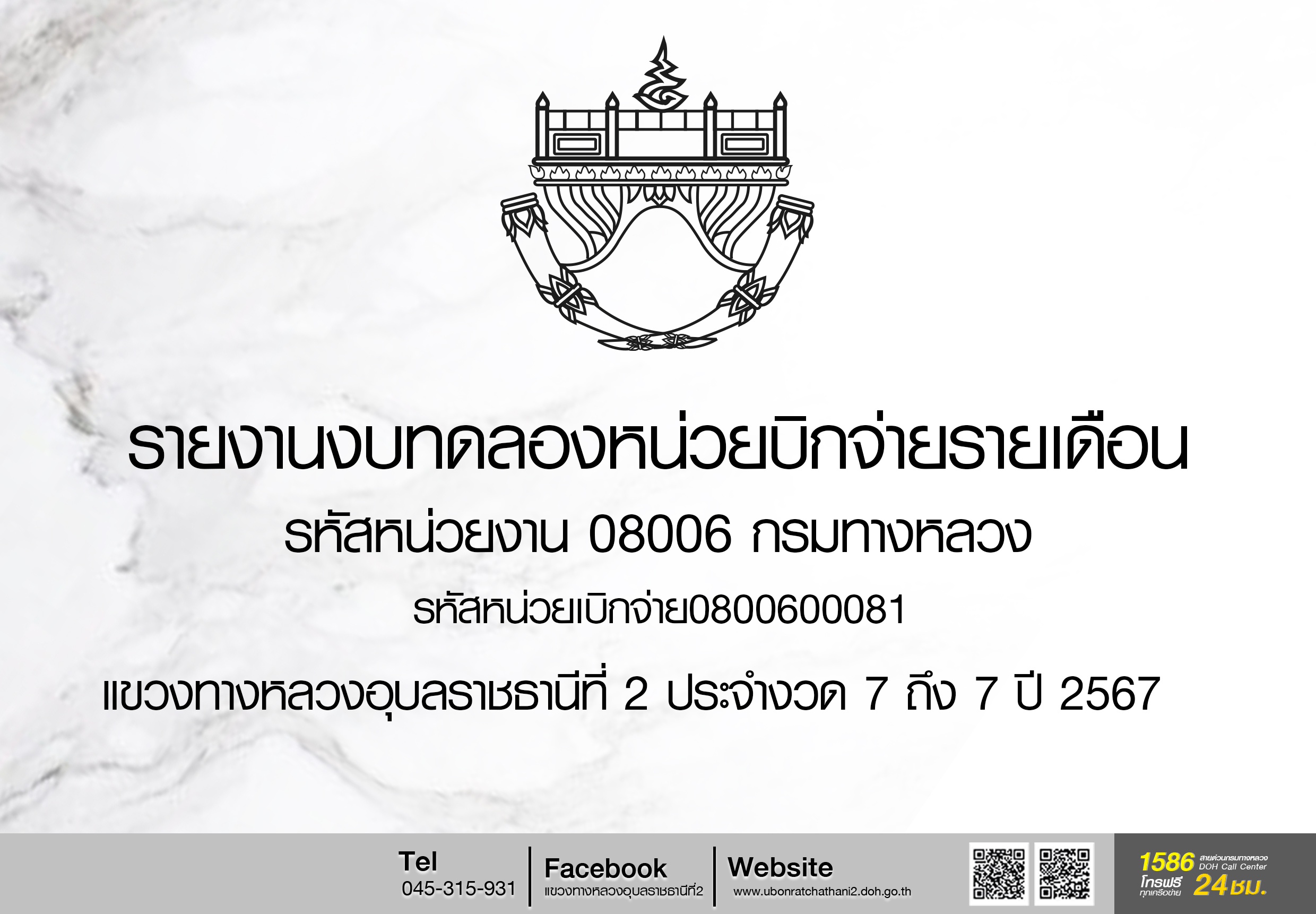 รายงานงบทดลองหน่วยบิกจ่ายรายเดือน รหัสหน่วยงาน 08006 กรมทางหลวง รหัสหน่วยเบิกจ่าย 0800600081 ขท อบ 2 ประจำงวด 7 ถึง 7 ปี 2567-