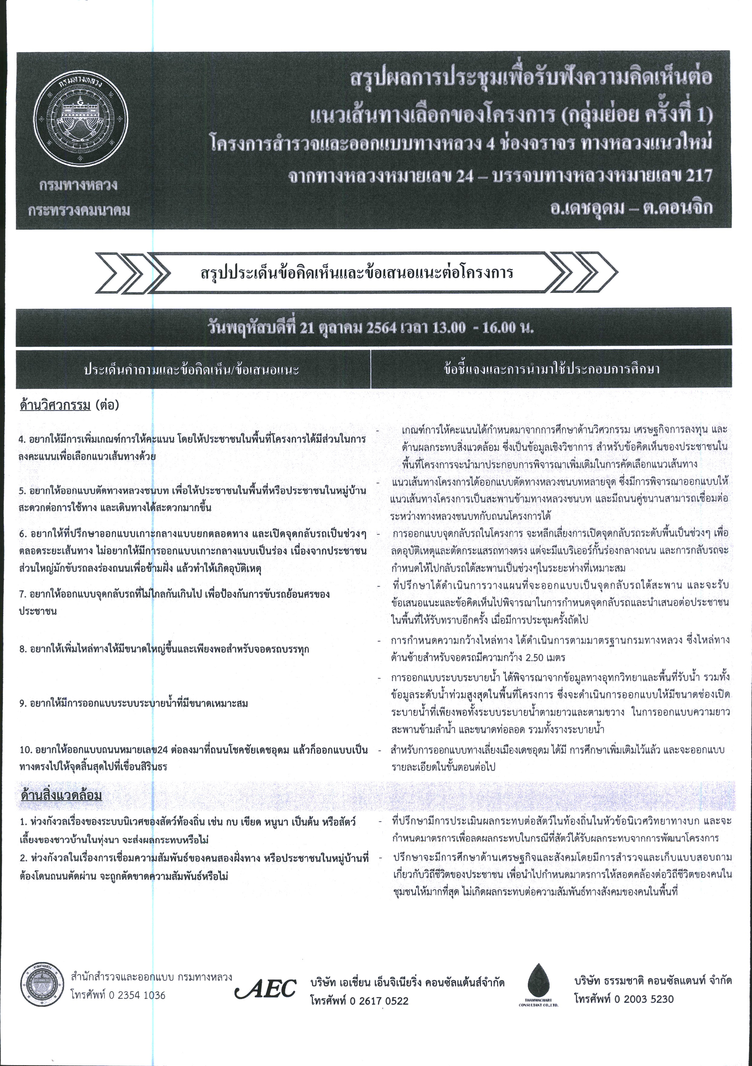 สรุปผลการประชุมเพื่อรับฟังความคิดเห็นต่อแนวทางเลือกของโครงการ (กลุ่มย่ิย ครั้งที่ 1) โครงการสำรวจและออกแบบทางหลวง 4 ช่องจราจร