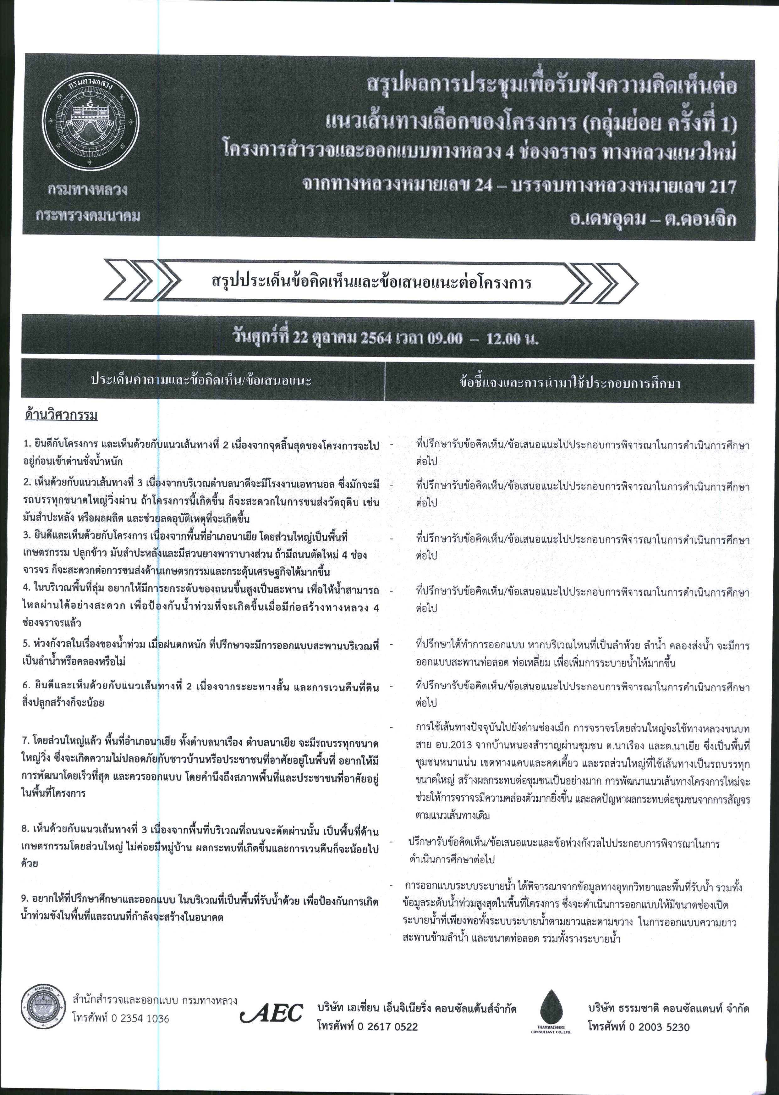สรุปผลการประชุมเพื่อรับฟังความคิดเห็นต่อแนวทางเลือกของโครงการ (กลุ่มย่อย ครั้งที่ 1) โครงการสำรวจและออกแบบทางหลวง 4 ช่องจราจร ทางหลวงแนวใหม่