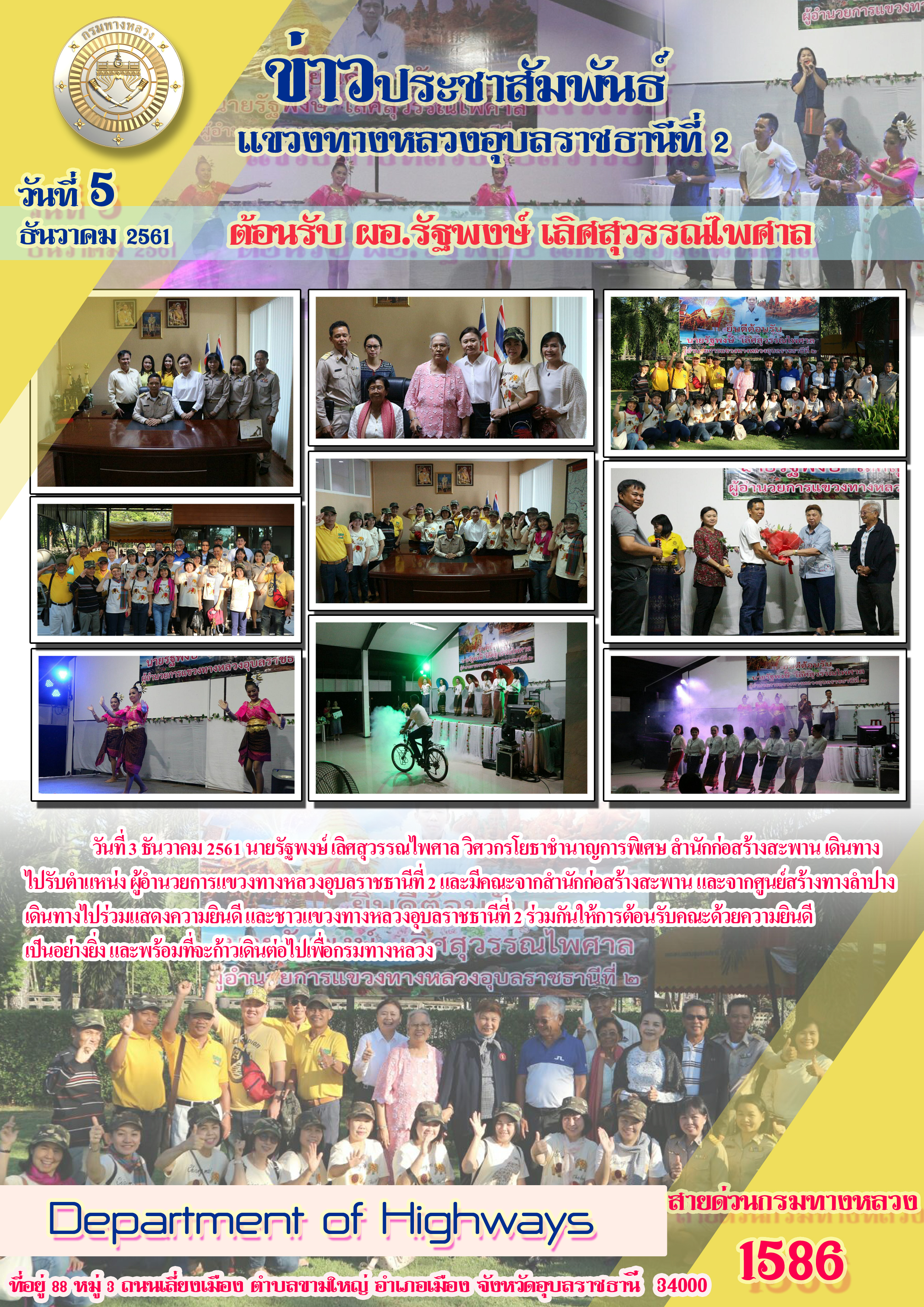 วันที่ 3 ธันวาคม 2561 นายรัฐพงษ์ เลิศสุวรรณไพศาล วิศวกรโยธาชำนาญการพิเศษ สำนักก่อสร้างสะพานเดินทางไปรับตำแหน่ง ผู้อำนวยการแขวงทางหลวงอุบลราชธานีที่ 2 และมีคณะจากสำนักก่อสร้างสะพานและจากศูนย์สร้างทางลำปางเดินทางไปร่วมแสดงความยินดีและชาวแขวงทางหลวงอุบลราชธานีที่ 2 ร่วมกันให้การต้อนรับคณะด้วยความยินดีเป็นอย่างยิ่งและพร้อมที่จะก้่าวเดินต่อไปเพื่อกรมทางหลวง