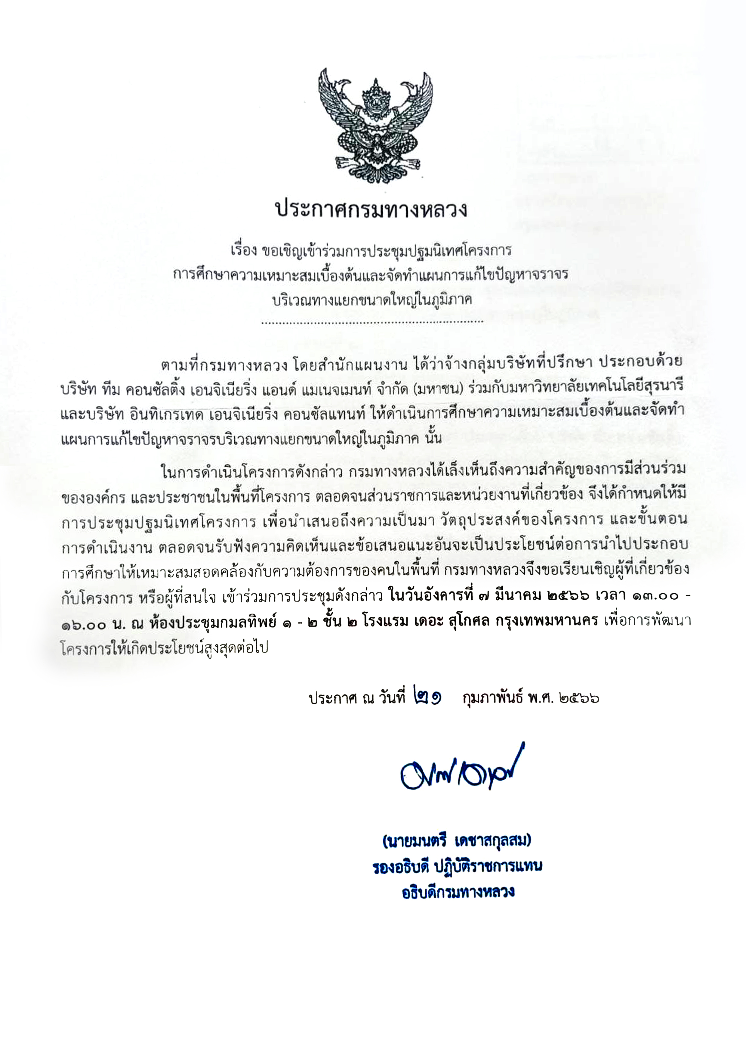 ประกาศกรมทางหลวง เรื่อง ขอเชิญเข้าร่วมการประชุมปฐมนิเทศโครงการการศึกษาความเหมาะสมเบื้องต้นและจัดทำแผนการแก้ไขปัญหาจราจรบริเวณทางแยกขนาดใหญ่ในภูมิภาค