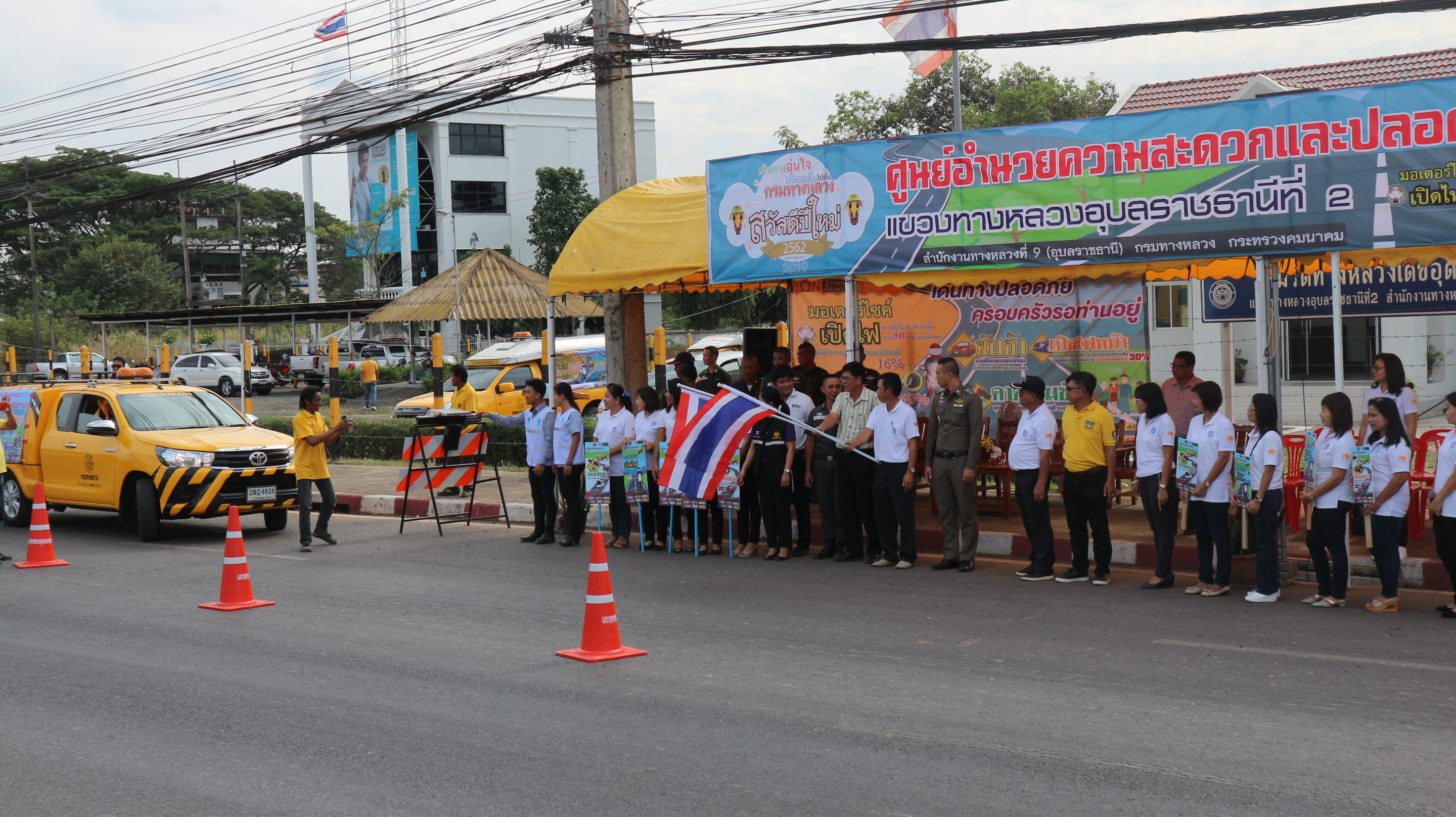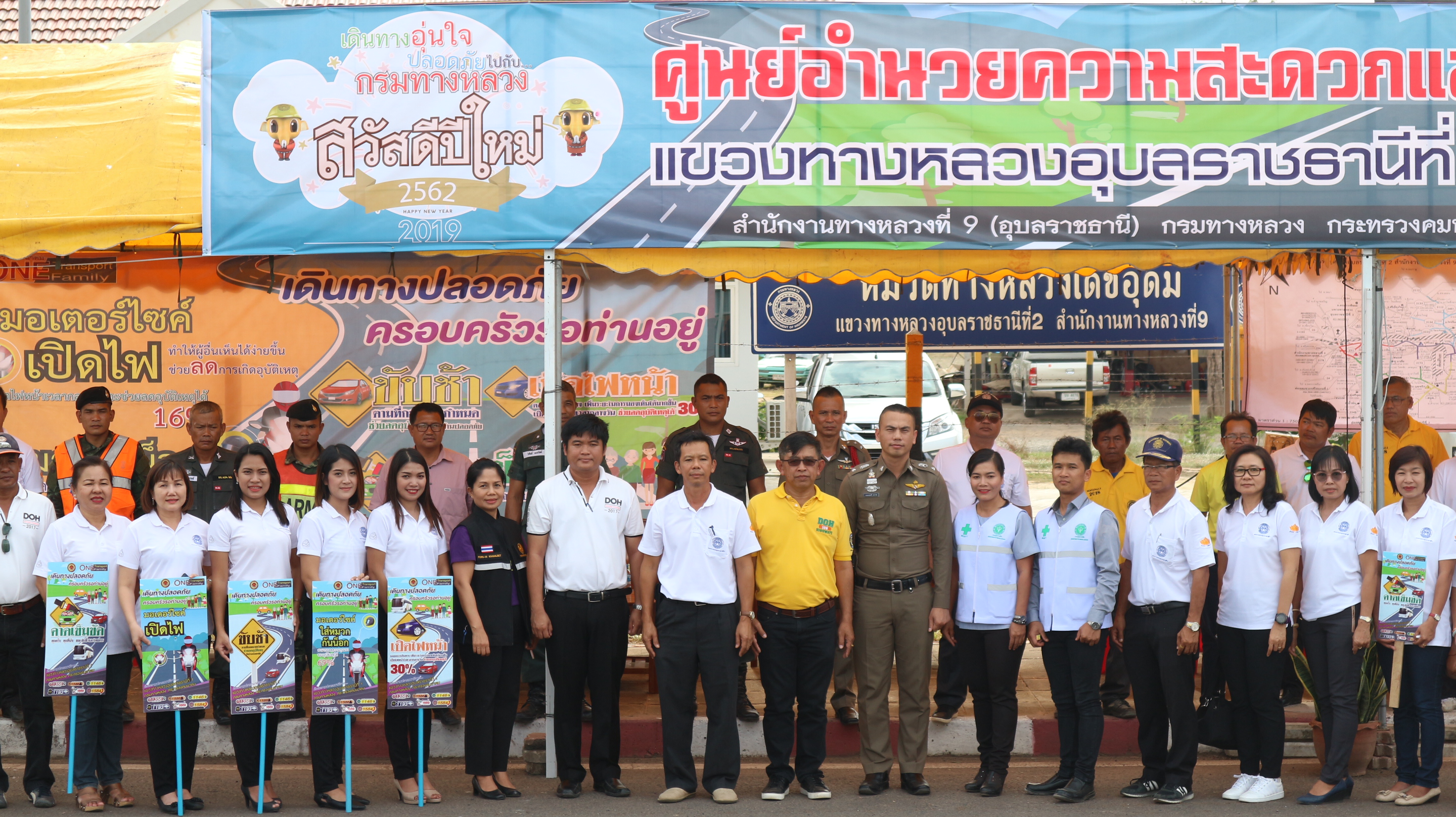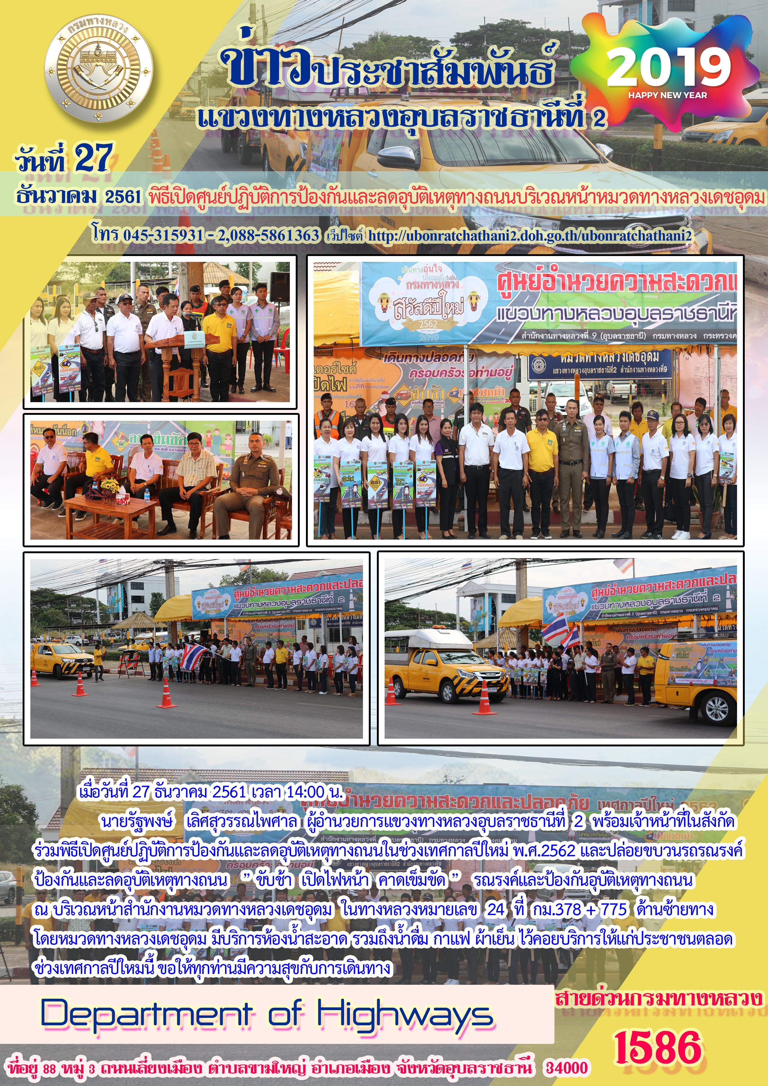 นายรัฐพงษ์ เลิศสุวรรณไพศาล ผู้อำนวยการแขวงทางหลวงอุบลราชธานีที่ 2 พร้อมเจ้าหน้าที่ในสังกัดร่วมพิธีเปิดศูนย์ปฏิบัติการป้องกันและลดอุบัติเหตุทางถนนในช่วงเทศกาลปีใหม่ พ.ศ.2562 และปล่อยขบวนรถรณรงค์ป้องกันและลดอุบัติเหตุทางถนน "ขับช้า เปิดไฟหน้า คาดเข็มขัด" รณรงค์และป้องกันอุบัติเหตุทางถนน ณ บริเวณหน้าสำนักงานหมวดทางหลวงเดชอุดม ในทางหลวงหมายเลข 24 ที่ กม.378 + 775 ด้านซ้ายทางโดยหมวดทางหลวงเดชอุดม มีบริการห้องน้ำสะอาด รวมถึงน้ำดื่ม กาแฟ ผ้าเย็น ไว้คอยบริการให้แก่ประชาชนตลอดช่วงเทศกาลปีใหม่ ขอให้ทุกท่านมีความสุขกับการเดินทาง