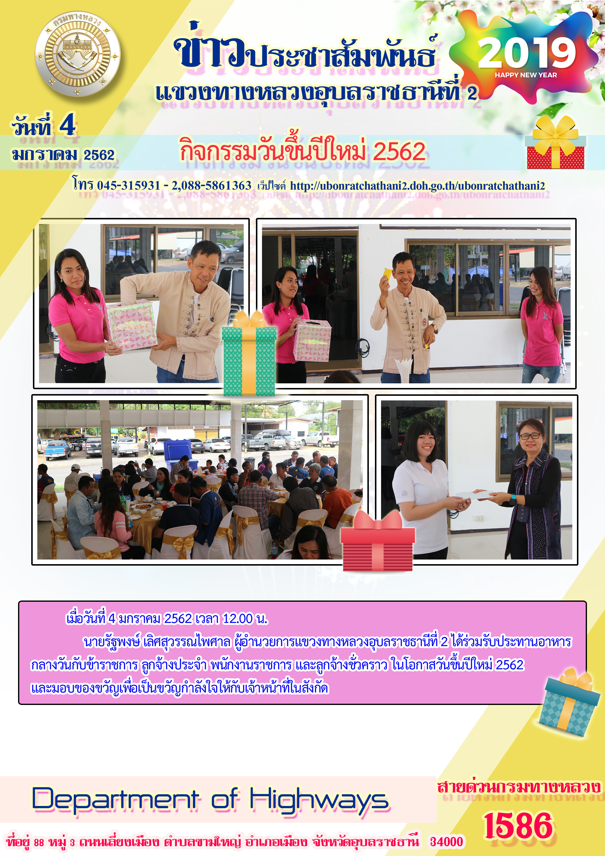 นายรัฐพงษ์ เลิศสุวรรณไพศาล ผู้อำนวยการแขวงทางหลวงอุบลราชธานีที่ 2 ได้ร่วมรับประทางอาหารกลางวันกับขัาราชการ ลูกจ้างประจำ พนักงานราชการ และลูกจ้างชั่วคราว ในโอกาสวันขึ้นปีใหม่ 2562 และมอบของขวัญเพื่อเป็นขวัญกำลังใจให้กับเจ้าหน้าที่ในสังกัด