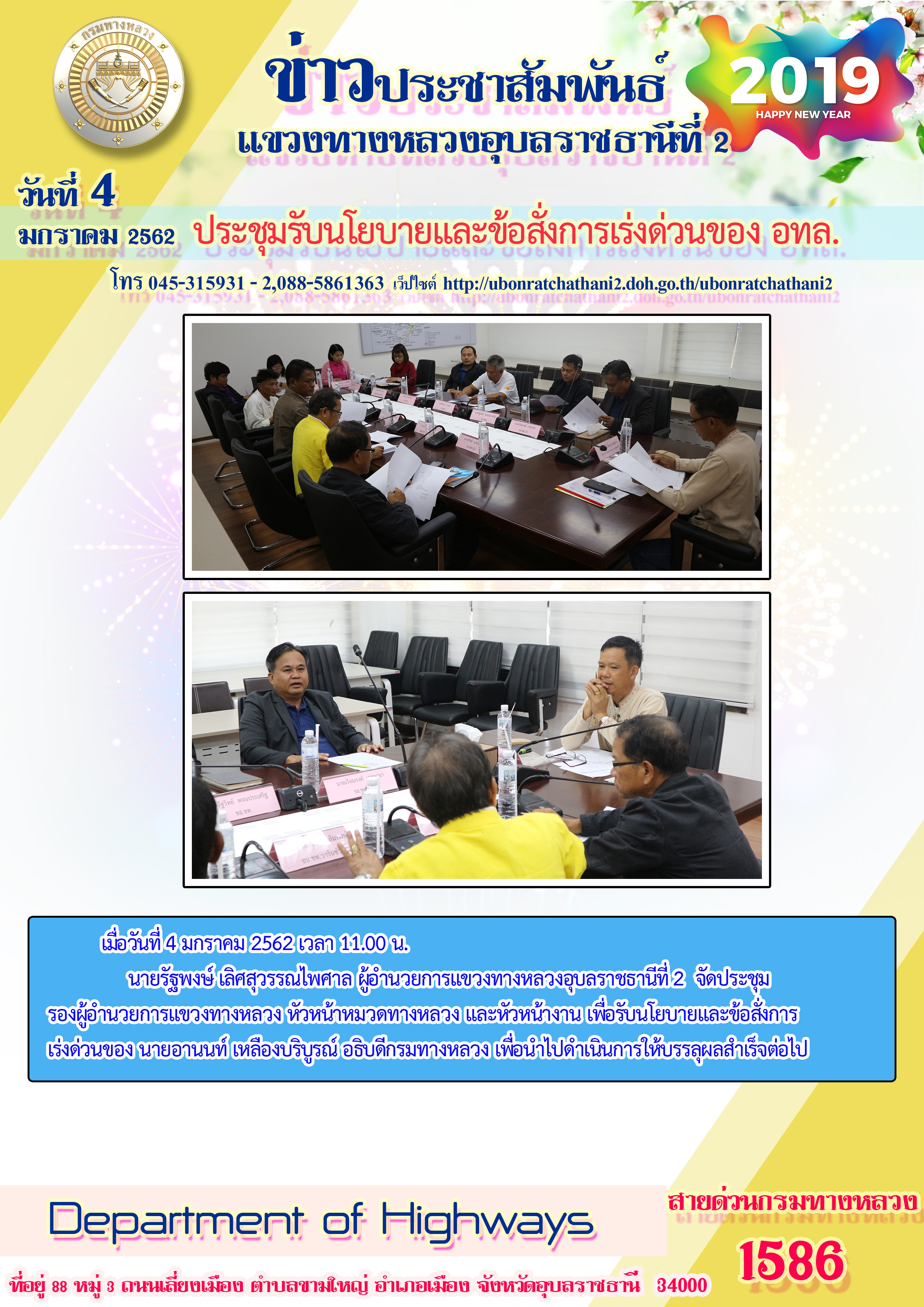 นายรัฐพงษ์ เลิศสุวรรณไพศาล ผู้อำนวยการแขวงทางหลวงอุบลราชธานีที่ 2 จัดประชุมรองผู้อำนวยการแขวงทางหลวง หัวหน้าหมวดทางหลวง และหัวหน้างาน เพื่อรับนโยบายและข้อสั่งการเร่งด่วนของ นายอานนท์ เหลืองบริบูรณ์ อธิบดีกรมทางกลวง เพื่อนำไปดำเนินการให้บรรลุผลสำเร็จต่อไป