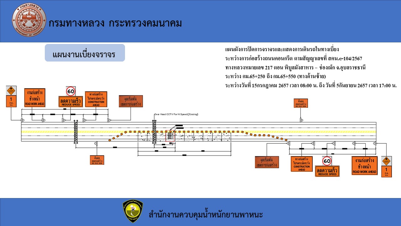 แขวงทางหลวงอุบลราชธานีที่2จะดำเนินการปิดการจราจรบนทางหลวงหมายเลข217 ตอน พิบูลมังสาหาร-ช่องเม็ก ตั้งแต่วันที่ 15 กรกฎาคม 2567-5กันยายน 2567 เพื่อให้ประชาชนผู้ใช้เส้นทางและผู้ที่เกี่ยวข้องได้ทราบ หลีกเลี่ยงการใช้เส้นทางดังกล่าว