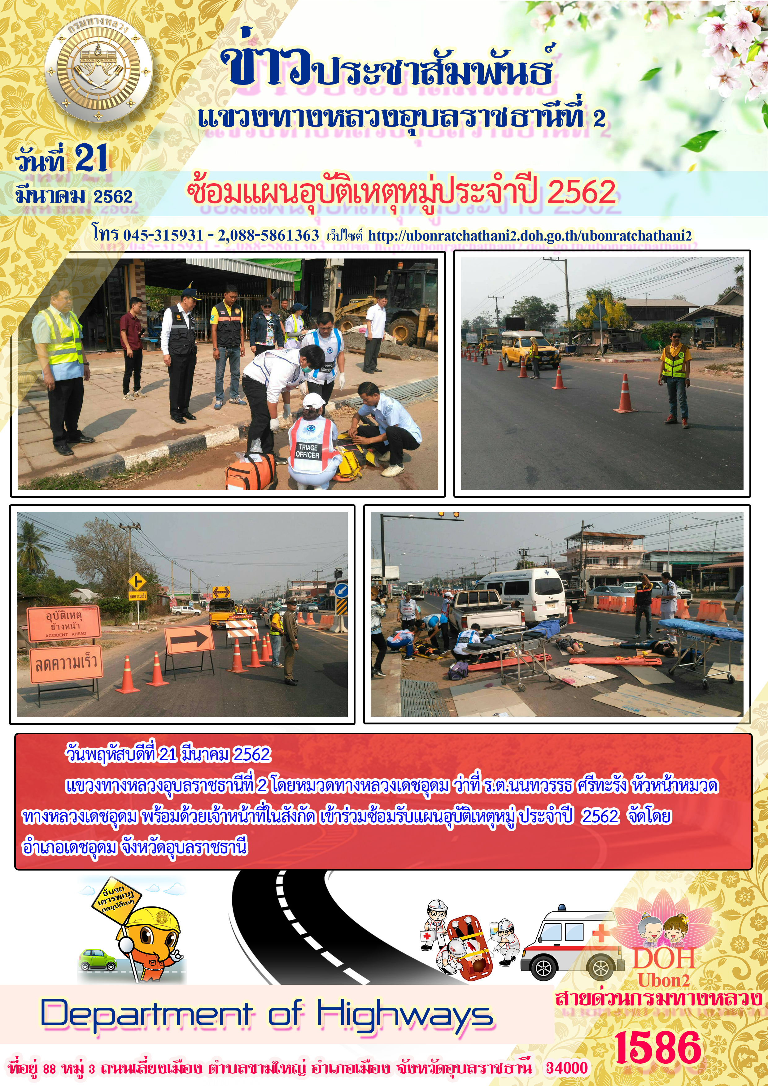 แขวงทางหลวงอุบลราชธานีที่ 2 โดยหมวดทางหลวงเดชอุดม ว่าที่ ร.ต.นนทวรรธ ศรีทะรัง หัวหน้าหมวด ทางหลวงเดชอุดม พร้อมด้วยเจ้าหน้าที่ในสังกัด เข้าร่วมซ้อมรับแผนอุบัติเหตุหมู่ ประจำปี 2562 จัดโดย อำเภอเดชอุดม จังหวัดอุบลราชธานี