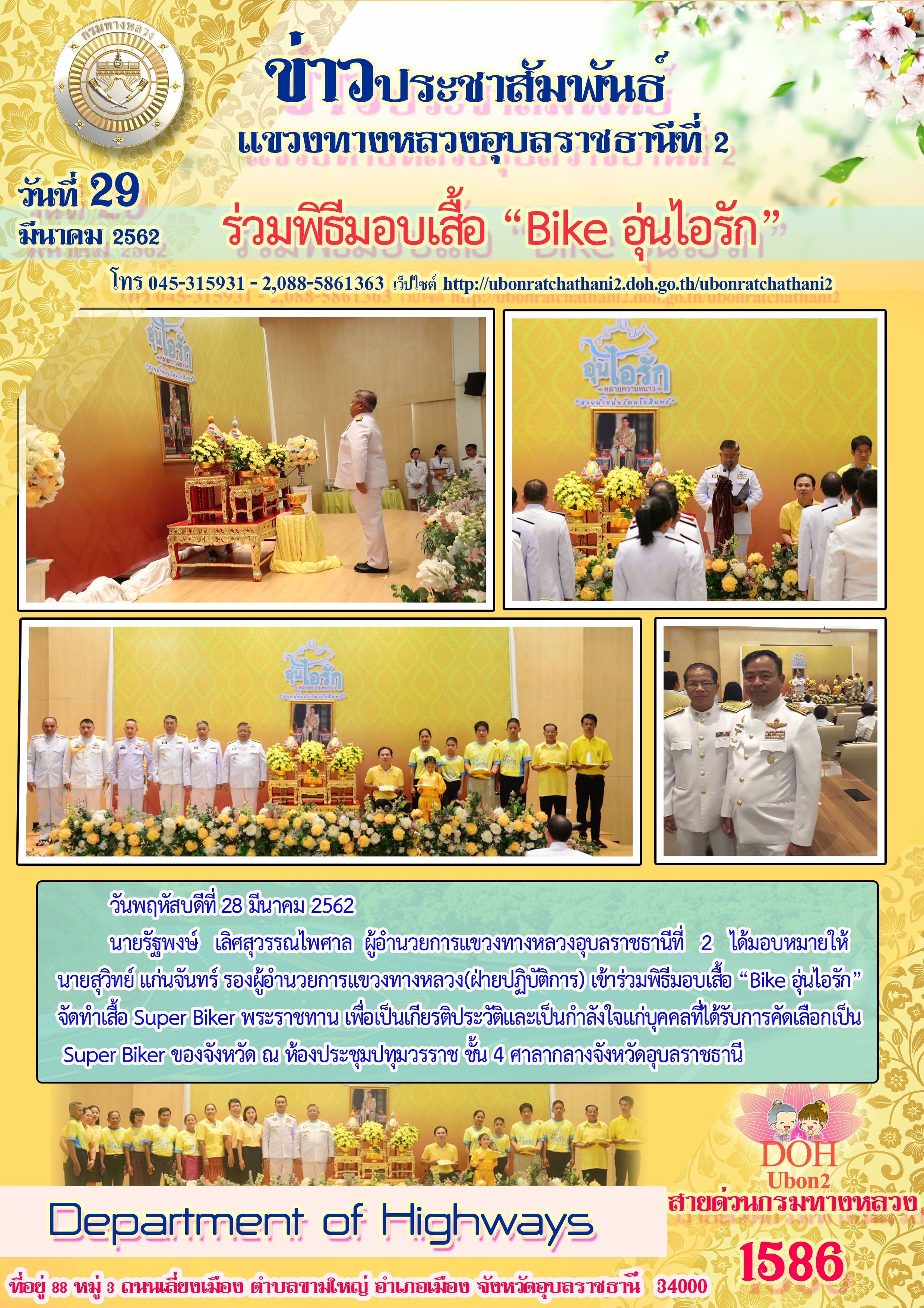 นายรัฐพงษ์ เลิศสุวรรณไพศาล ผู้อำนวยการแขวงทางหลวงอุบลราชธานีที่ 2 ได้มอบหมายให้ นายสุวิทย์ แก่นจันทร์ รองผู้อำนวยการแขวทางหลวง(ฝ่ายปฏิบัติการ) เข้าร่วมพิธีมอบเสื้อ “Bike อุ่นไอรัก” จัดทำเสื้อ Super Biker พระราชทาน เพื่อเป็นเกียรติประวัติและเป็นกำลังใจแก่บุคคลที่ได้รับการคัดเลือกเป็น Super Biker ของจังหวัด ณ ห้องประชุมปทุมวรราช ชั้น 4 ศาลากลางจังหวัดอุบลราชธานี