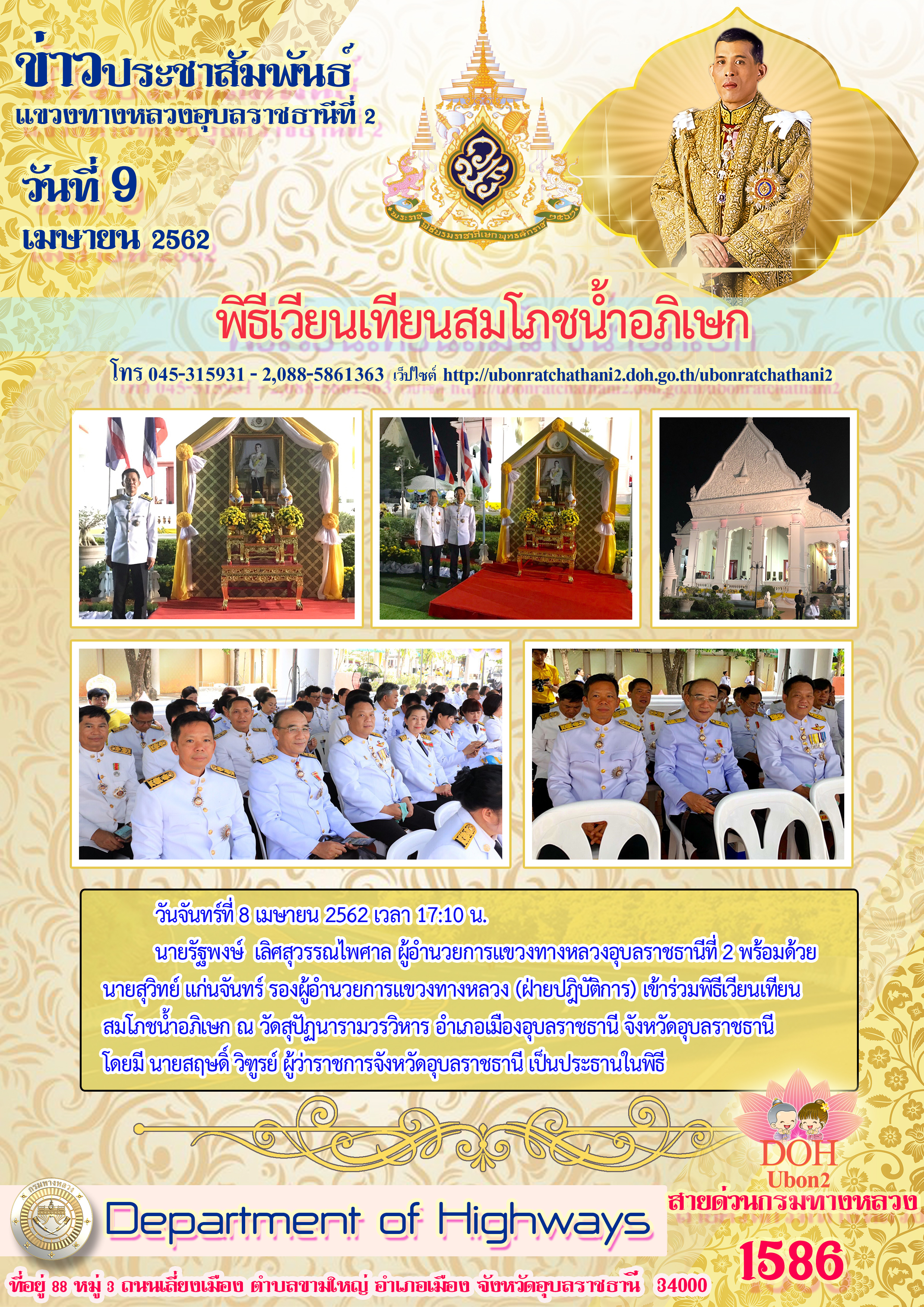 นายรัฐพงษ์ เลิศสุวรรณไพศาล ผู้อำนวยการแขวงทางหลวงอุบลราชธานีที่ 2 พร้อมด้วย นายสุวิทย์ แก่นจันทร์ รองผู้อำนวยการแขวงทางหลวง (ฝ่ายปฎิบัติการ) เข้าร่วมพิธีเวียนเทียน สมโภชน้ำอภิเษก ณ วัดสุปัฏนารามวรวิหาร อำเภอเมืองอุบลราชธานี จังหวัดอุบลราชธานีโดยมี นายสฤษดิ์ วิฑูรย์ ผู้ว่าราชการจังหวัดอุบลราชธานี เป็นประธานในพิธี