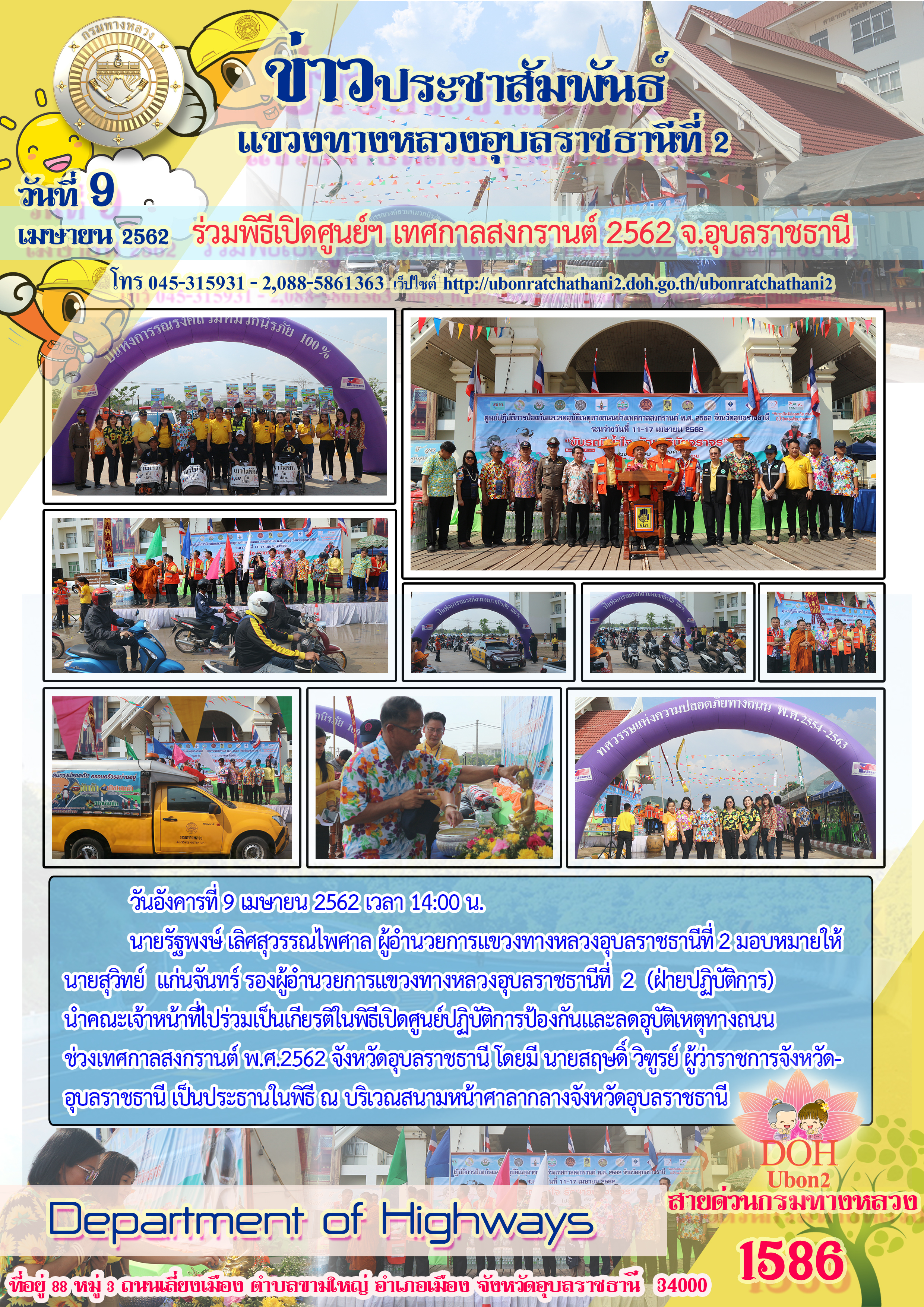 นายรัฐพงษ์ เลิศสุวรรณไพศาล ผู้อำนวยการแขวงทางหลวงอุบลราชธานีที่ 2 มอบหมายให้นายสุวิทย์ แก่นจันทร์ รองผู้อำนวยการแขวงทางหลวงอุบลราชธานีที่ 2 (ฝ่ายปฏิบัติการ) นำคณะเจ้าหน้าที่ไปร่วมเป็นเกียรติในพิธีเปิดศูนย์ปฏิบัติการป้องกันและลดอุบัติเหตุทางถนนช่วงเทศกาลสงกรานต์ พ.ศ.2562 จังหวัดอุบลราชธานี โดยมี นายสฤษดิ์ วิฑูรย์ ผู้ว่าราชการจังหวัดอุบลราชธานี เป็นประธานในพิธี ณ บริเวณสนามหน้าศาลากลางจังหวัดอุบลราชธานี