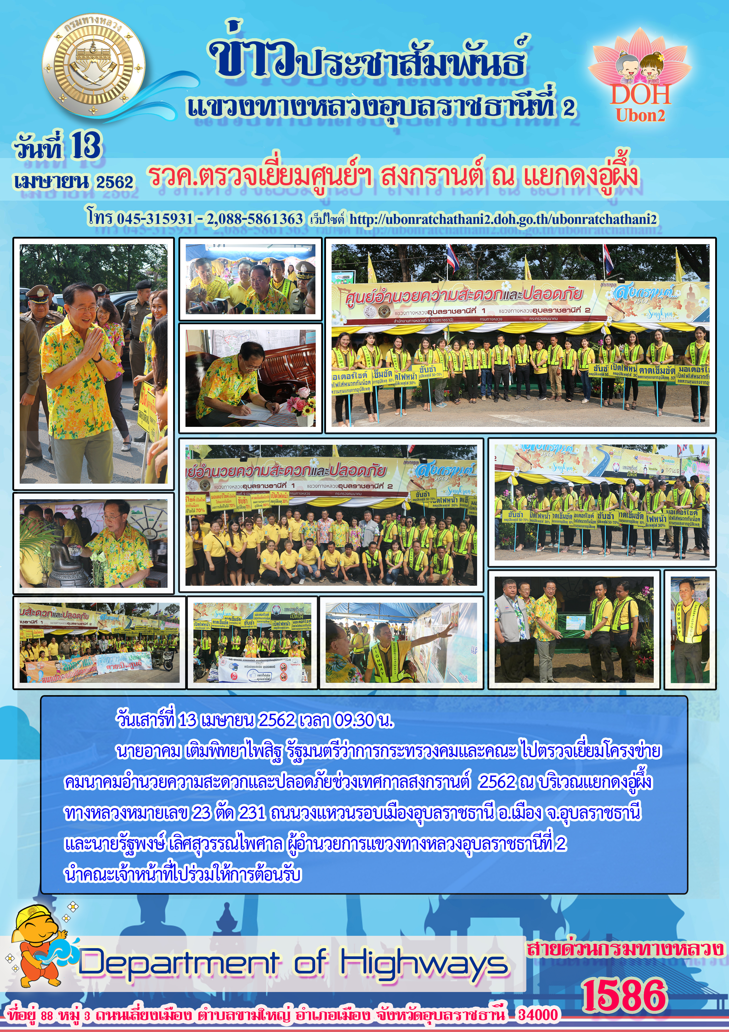 นายอาคม เติมพิทยาไพสิฐ รัฐมนตรีว่าการกระทรวงคมและคณะ ไปตรวจเยี่ยมโครงข่าย คมนาคมอำนวยความสะดวกและปลอดภัยช่วงเทศกาลสงกรานต์ 2562 ณ บริเวณแยกดงอู่ผึ้ง ทางหลวงหมายเลข 23 ตัด 231 ถนนวงแหวนรอบเมืองอุบลราชธานี อ.เมือง จ.อุบลราชธานี และนายรัฐพงษ์ เลิศสุวรรณไพศาล ผู้อำนวยการแขวงทางหลวงอุบลราชธานีที่ 2 นำคณะเจ้าหน้าที่ไปร่วมให้การต้อนรับ