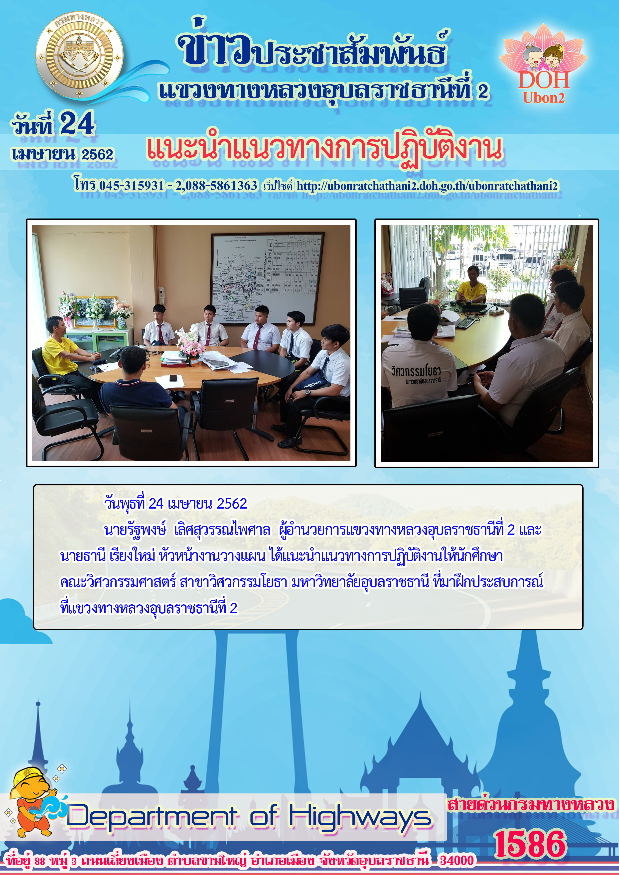 นายรัฐพงษ์ เลิศสุวรรณไพศาล ผู้อำนวยการแขวงทางหลวงอุบลราชธานีที่ 2 และ นายธานี เรียงใหม่ หัวหน้างานวางแผน ได้แนะนำแนวทางการปฏิบัติงานให้นักศึกษา คณะวิศวกรรมศาสตร์ สาขาวิศวกรรมโยธา มหาวิทยาลัยอุบลราชธานี ที่มาฝึกประสบการณ์ ที่แขวงทางหลวงอุบลราชธานีที่ 2
