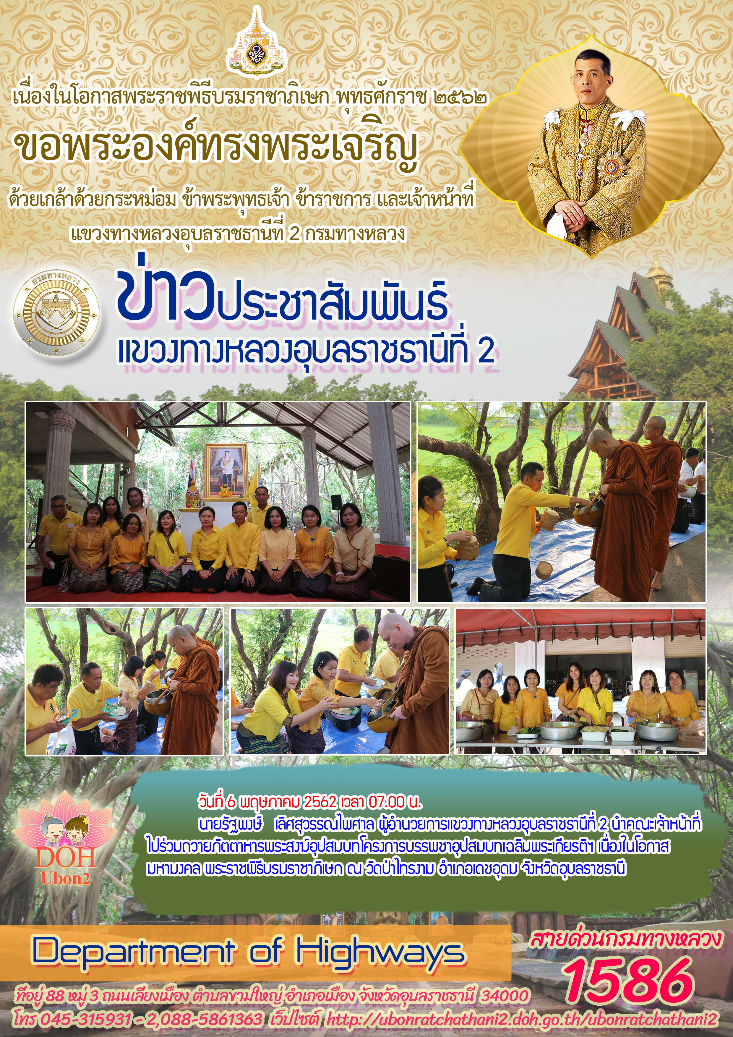 นายรัฐพงษ์ เลิศสุวรรณไพศาล ผู้อำนวยการแขวงทางหลวงอุบลราชธานีที่ 2 นำคณะเจ้าหน้าที่ ไปร่วมถวายภัตตาหารพระสงฆ์อุปสมบทโครงการบรรพชาอุปสมบทเฉลิมพระเกียรติฯ เนื่องในโอกาส มหามงคล พระราชพิธีบรมราชาภิเษก ณ วัดป่าไทรงาม อำเภอเดชอุดม จังหวัดอุบลราชธานี
