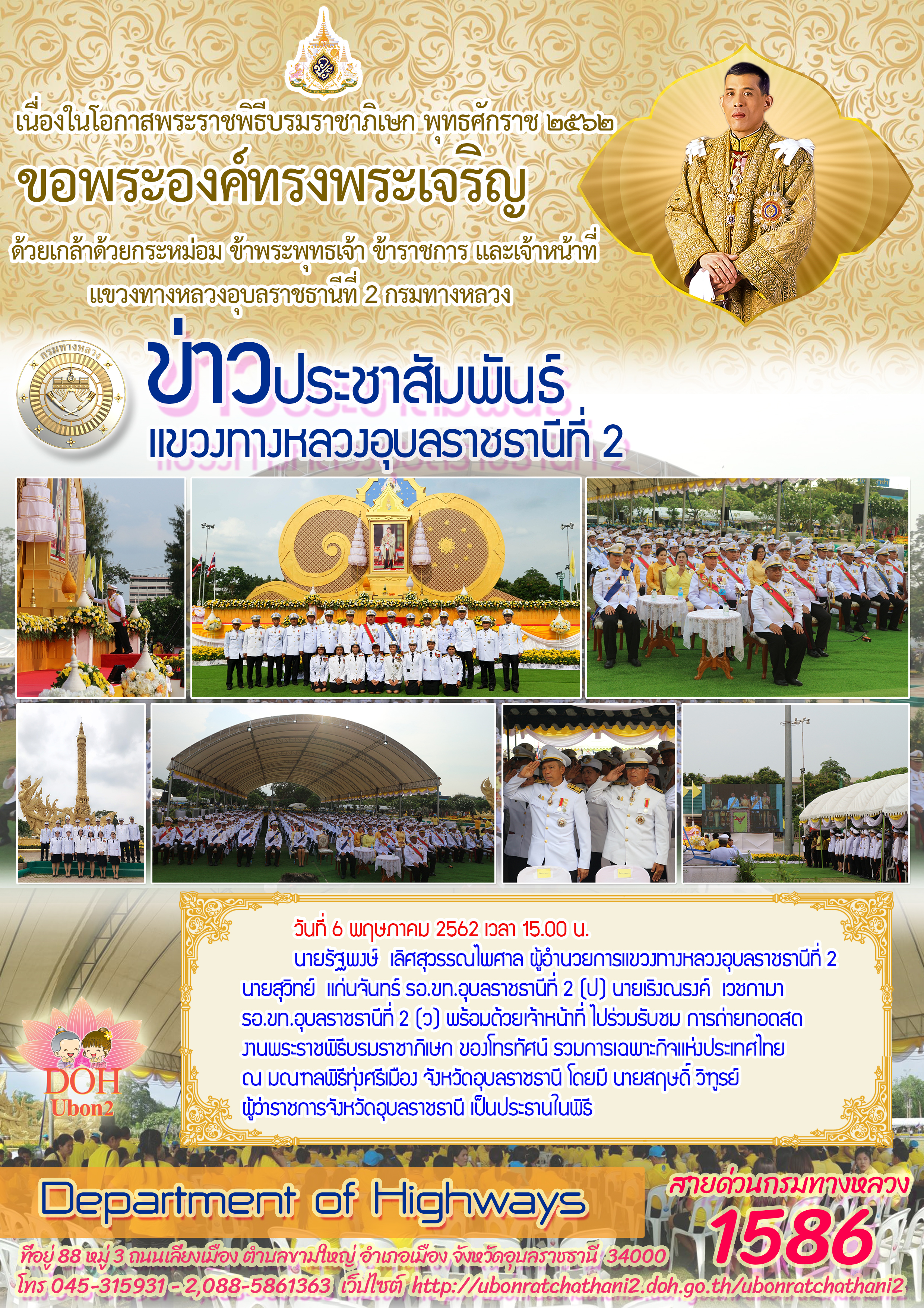 วันที่ 6 พฤษภาคม 2562 เวลา 15.00 น. นายรัฐพงษ์ เลิศสุวรรณไพศาล ผู้อำนวยการแขวงทางหลวงอุบลราชธานีที่ 2 นายสุวิทย์ แก่นจันทร์ รอ.ขท.อุบลราชธานีที่ 2 (ป) นายเริงณรงค์ เวชกามา รอ.ขท.อุบลราชธานีที่ 2 (ว) พร้อมด้วยเจ้าหน้าที่ ไปร่วมรับชม การถ่ายทอดสด งานพระราชพิธีบรมราชาภิเษก ของโทรทัศน์ รวมการเฉพาะกิจแห่งประเทศไทย ณ มณฑลพิธีทุ่งศรีเมือง จังหวัดอุบลราชธานี โดยมี นายสฤษดิ์ วิฑูรย์ ผู้ว่าราชการจังหวัดอุบลราชธานี เป็นประธานในพิธี