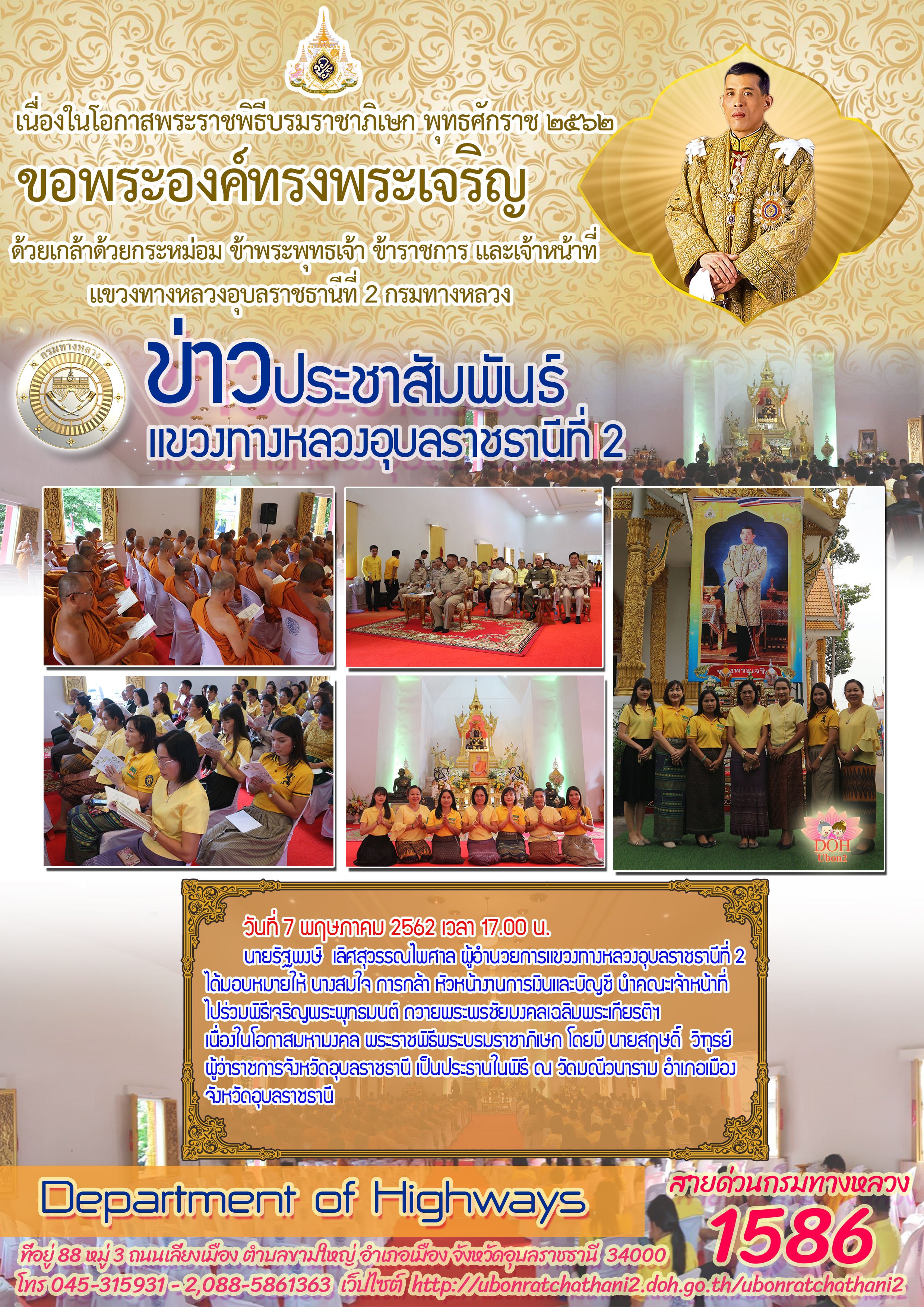 นายรัฐพงษ์ เลิศสุวรรณไพศาล ผู้อำนวยการแขวงทางหลวงอุบลราชธานีที่ 2 ได้มอบหมายให้ นางสมใจ การกล้า หัวหน้างานการเงินและบัญชี นำคณะเจ้าหน้าที่ ไปร่วมพิธีเจริญพระพุทธมนต์ ถวายพระพรชัยมงคลเฉลิมพระเกียรติฯ เนื่องในโอกาสมหามงคล พระราชพิธีพระบรมราชาภิเษก โดยมี นายสฤษดิ์ วิฑูรย์ ผู้ว่าราชการจังหวัดอุบลราชธานี เป็นประธานในพิธี ณ วัดมณีวนาราม อำเภอเมือง จังหวัดอุบลราชธานี